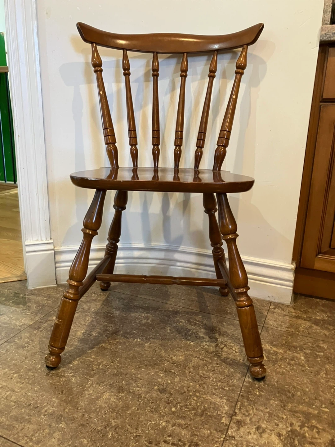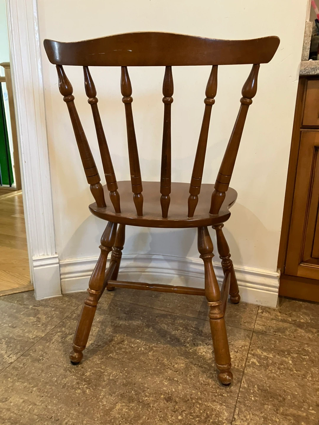 A classic wooden chair with a spindle back design. It's a rich brown colour and made from solid wood. This chair is suitable for dining or as an accent piece.