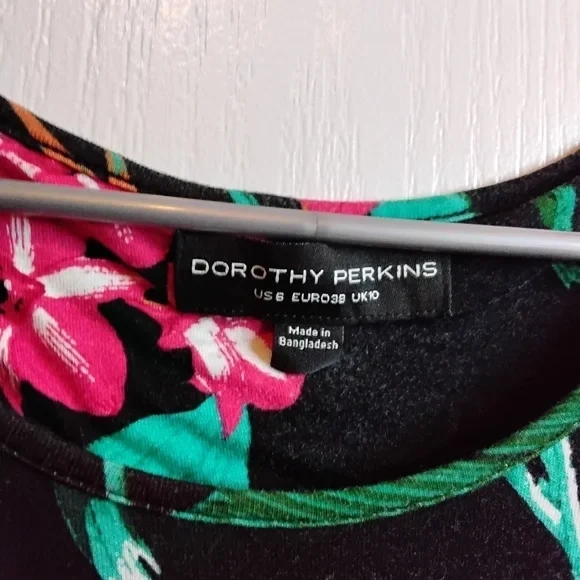 This is a lovely floral maxi dress from Dorothy Perkins. It's a size US 6 (EUR 38, UK 10) and is made in Bangladesh. The dress features a beautiful floral pattern on a black background, perfect for a casual or semi-formal occasion
