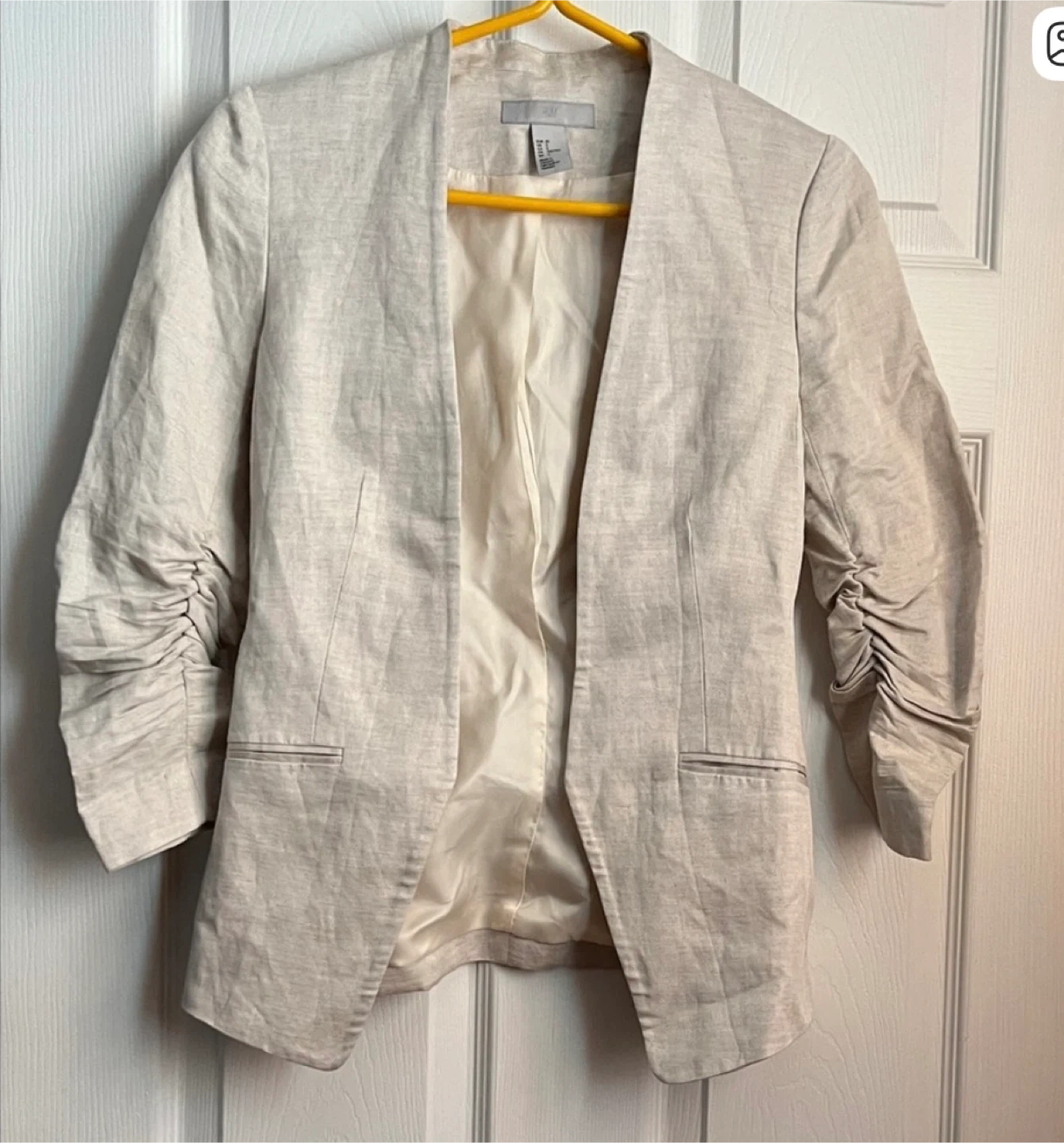 Lightweight linen blend blazer from H&M. Features ruched sleeves and two front pockets. Lined interior. Great for layering over outfits!