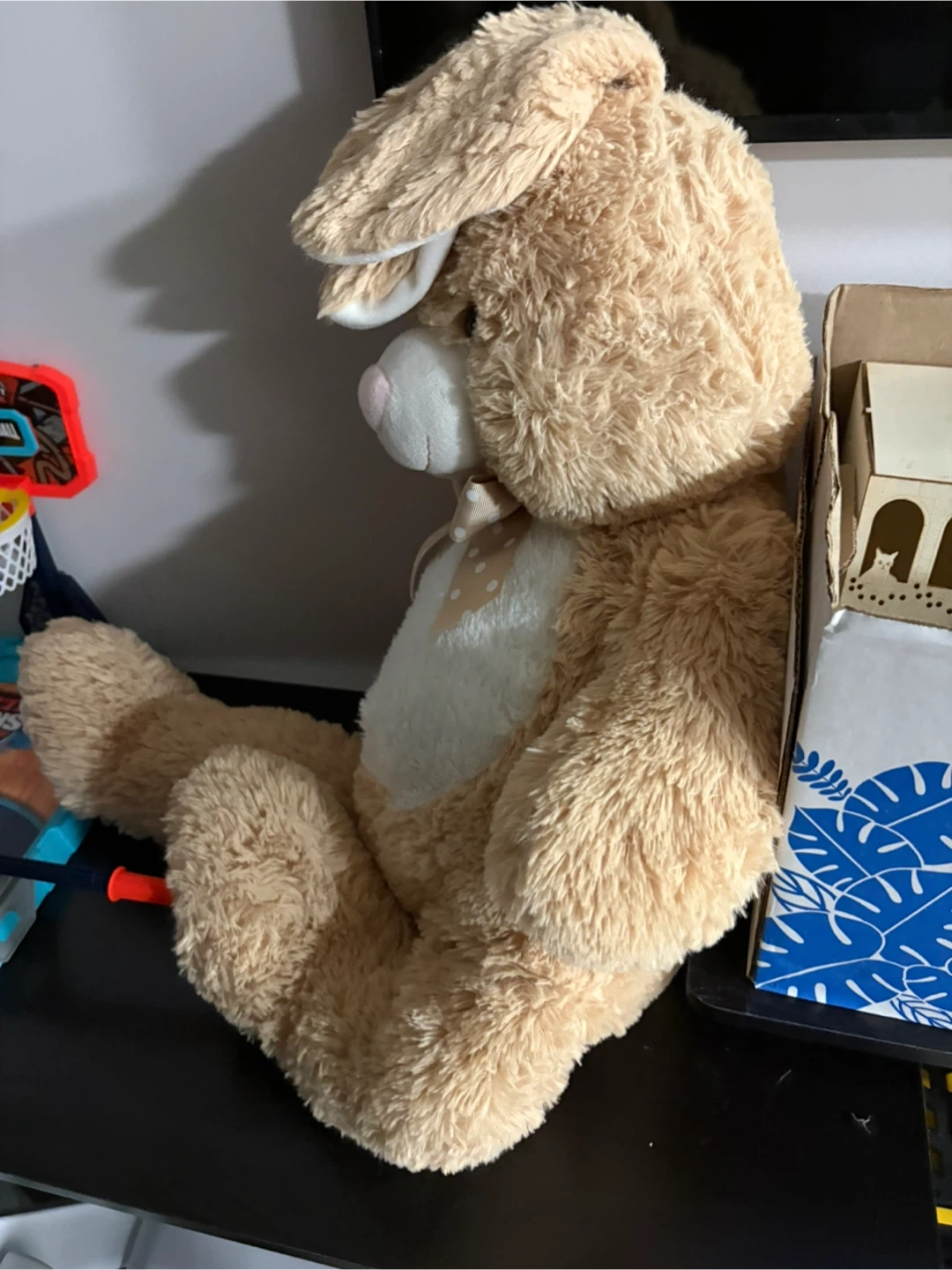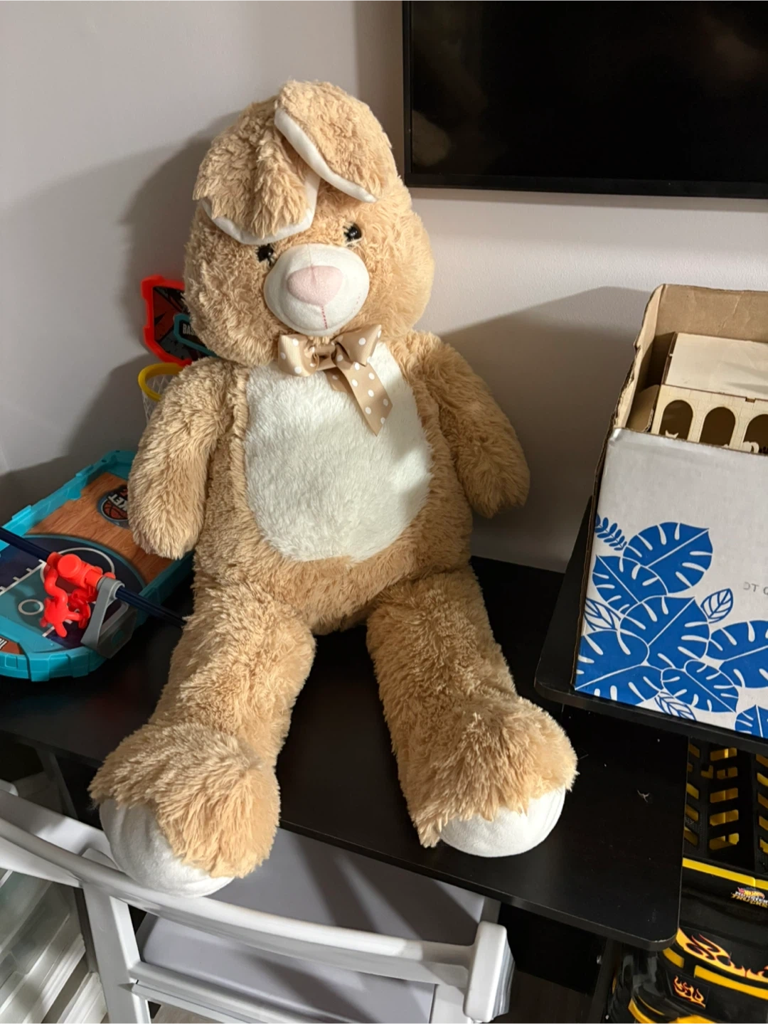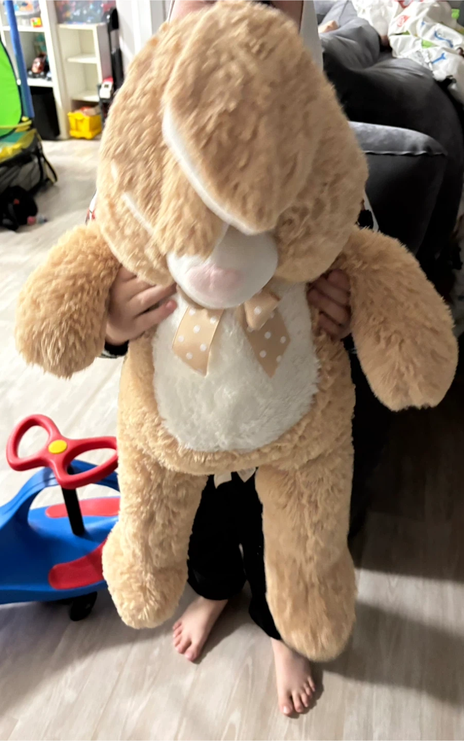 This is a large, soft plush bunny toy. It's a light brown colour with a white belly and a polka dot bow. It's a cuddly size for a child.