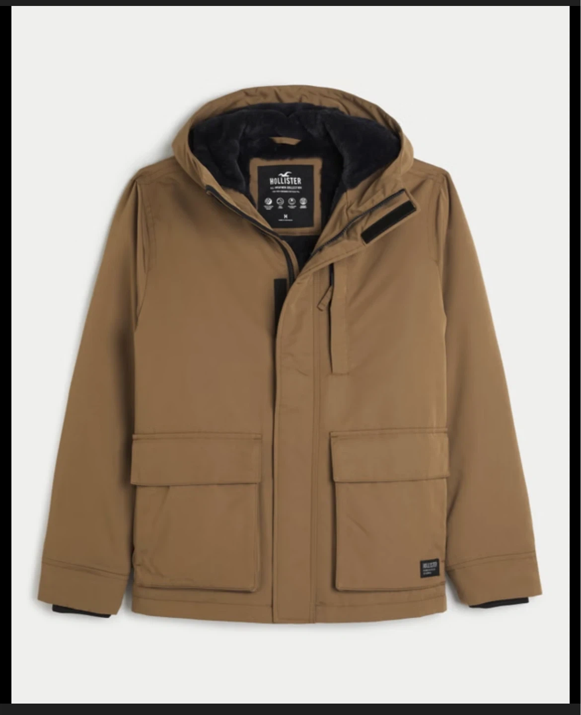 Warm hooded parka jacket from Hollister. It's a nice brown colour with a faux fur lined hood. Includes two front pockets and a zippered chest pocket. Size S