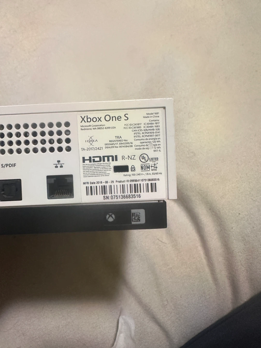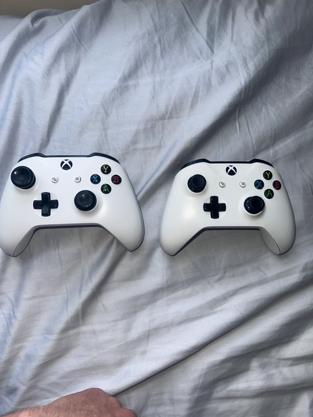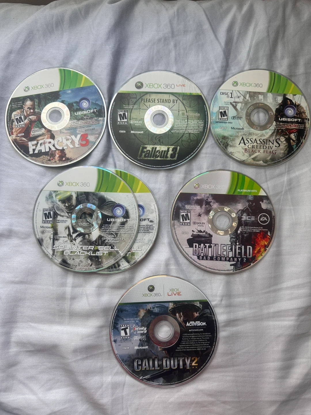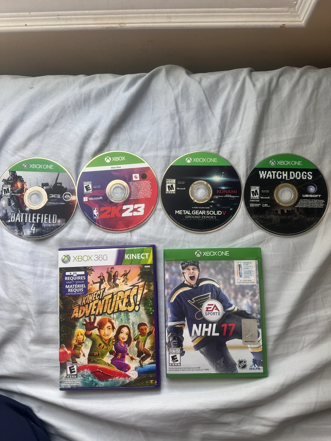 Two white Xbox One controllers and a collection of games for Xbox One and Xbox 360. Includes NHL 17, Watch Dogs, Battlefield 4, 2K23, and Metal Gear Solid V for Xbox One. Also includes Far Cry 3, Fallout 3, Assassin's Creed: Black Flag, Splinter Cell: Blacklist, Battlefield 3, Call of Duty 2, and Ghost Recon: Advanced Fighter 2 for Xbox 360. Also includes Kinect Adventures for Xbox 360.