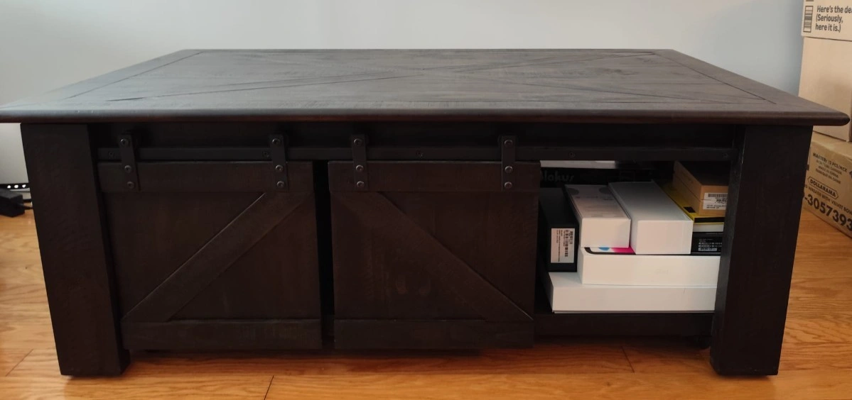 It features sliding barn doors on both sides and a lift-top mechanism that allows you to use it as a workspace or dining surface. The table also offers very large internal storage.