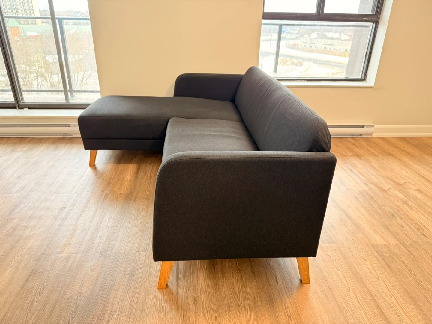This dark grey sectional sofa features a chaise for extra lounging space. It's upholstered in a durable fabric with wooden legs. This couch is perfect for a living room or apartment.