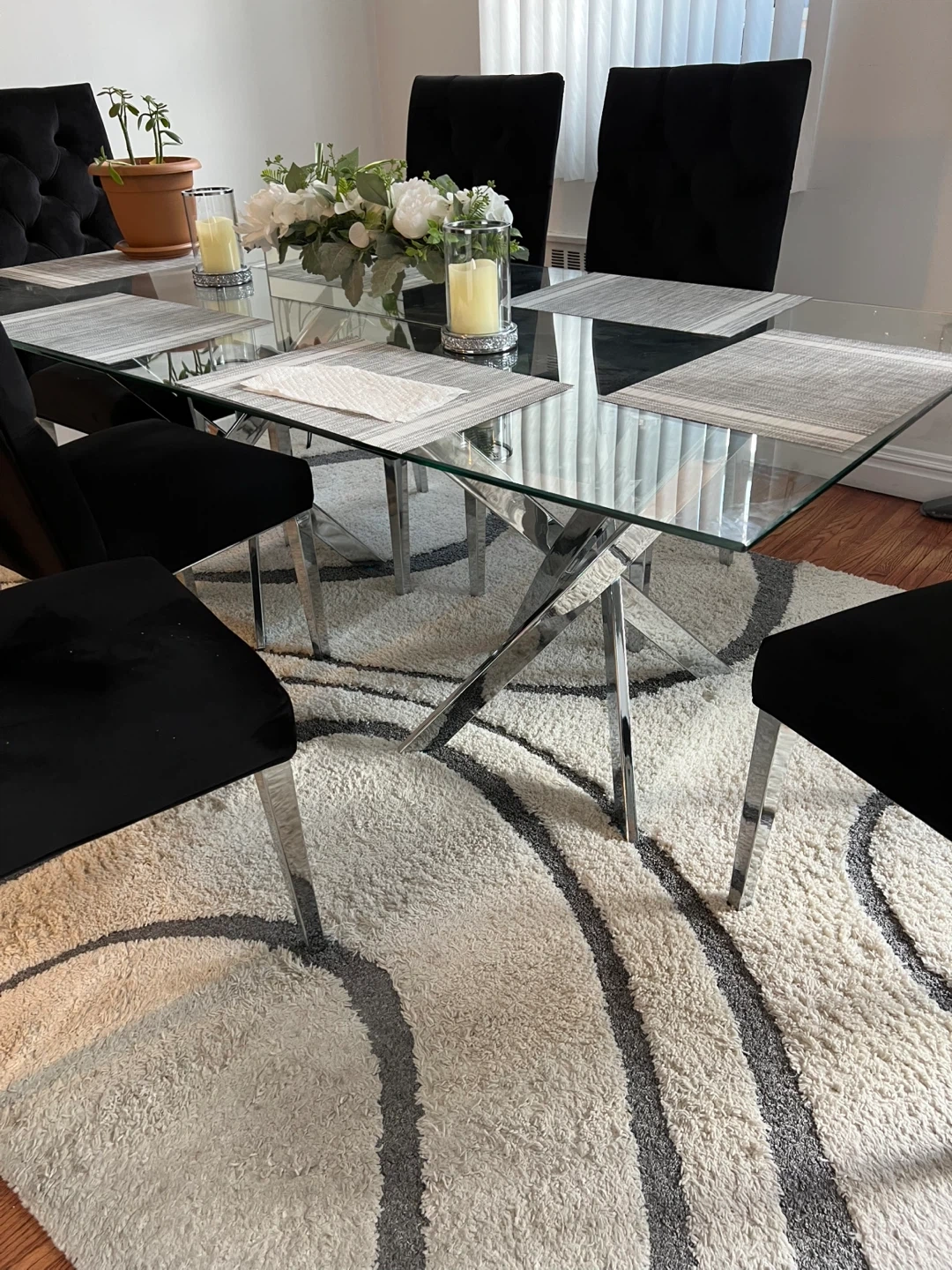 Glass top dining table with a chrome X-leg base. 6 black velvet dining chairs with chrome legs included. Seats six people comfortably.