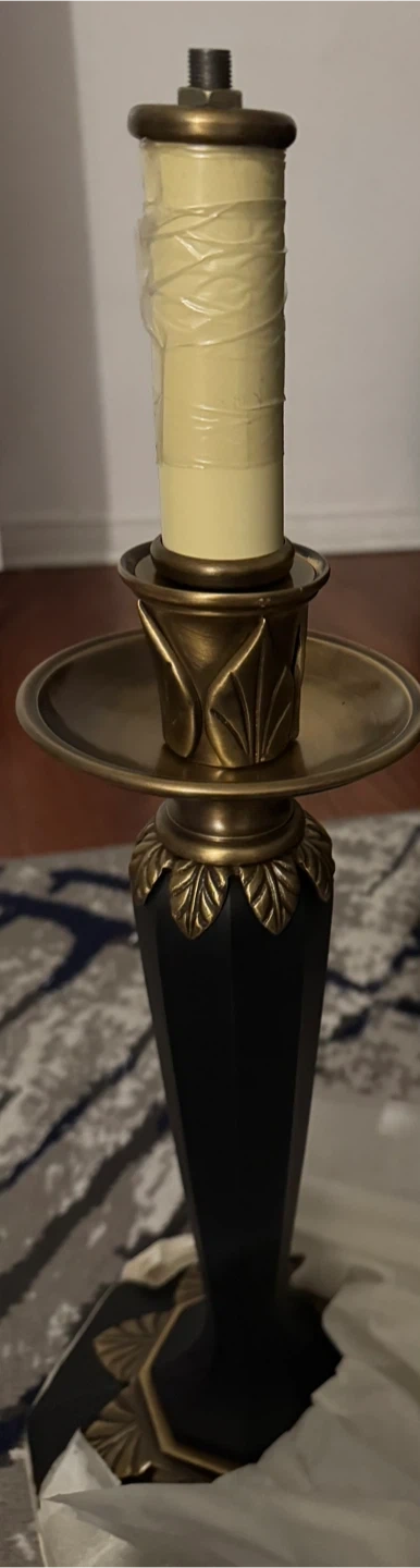 This elegant table lamp features a decorative brass base with black accents. It has a classic candlestick-style light socket. Adds a touch of vintage charm to any room!