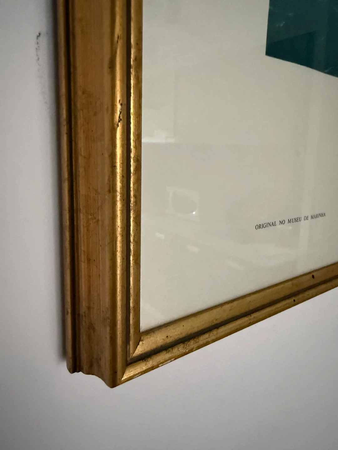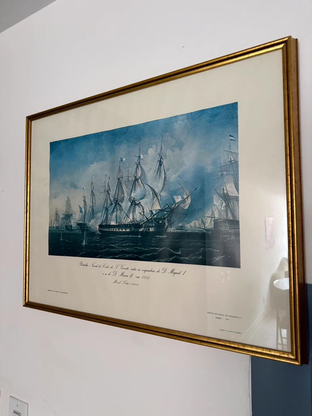 Framed print depicting a naval battle scene titled "Batalha Naval do Cabo de S. Vicente entre as esquadras de D. Miguel I e a de D. Maria II em 1750". It's labeled as "Original no Museu de Marinha". The frame is gold-toned with a classic design. This artwork would be a striking addition to any room. 50 yrs old!