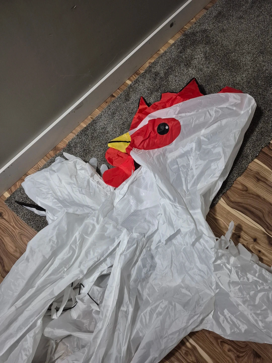 This is an inflatable chicken costume. It's white with a red and yellow rooster head. One size fits most.