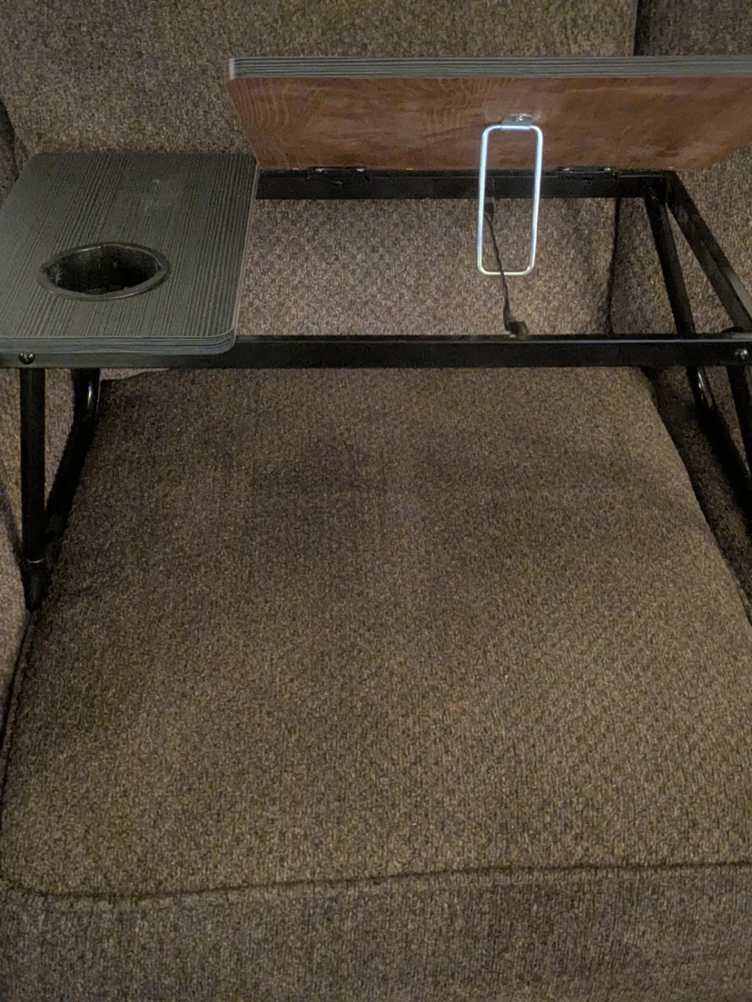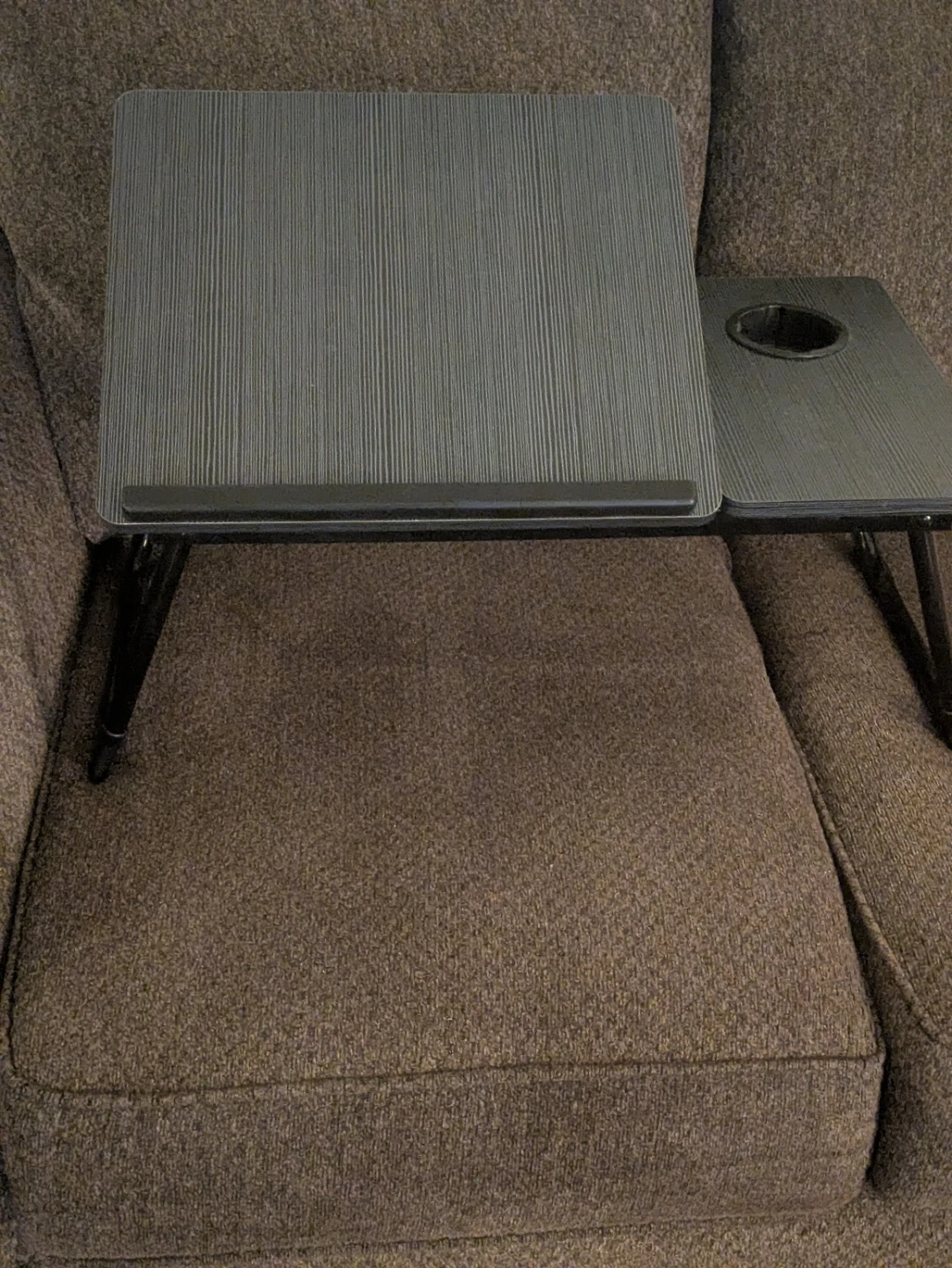 I'm selling a used lap desk, perfect for working or browsing on your laptop from the comfort of your couch or bed. It features a built-in cup holder. It's in good condition.