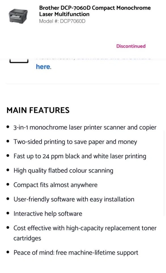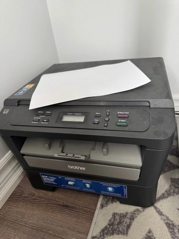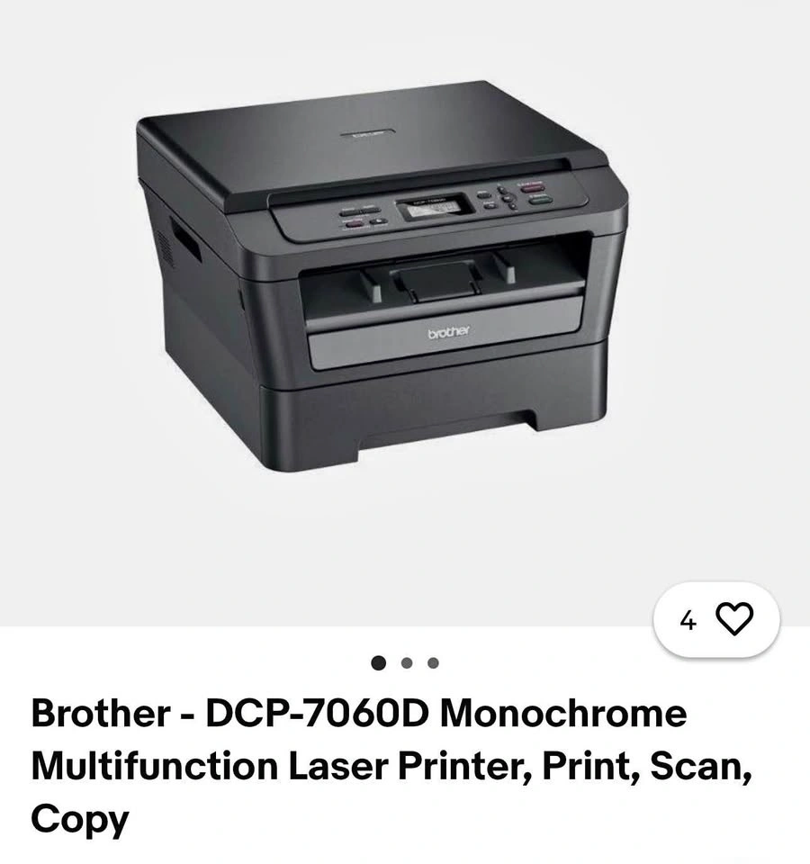 Reliable black & white laser printing with automatic duplex. USB connection (no Wi-Fi). Uses inexpensive Brother TN-450 / TN-420 toner cartridges. Fully functional. It is a multifunction LASER printer and has double-sided MONOCHROME printing and COLOUR scanning. Pick up in Courtice. Please check my other listings.