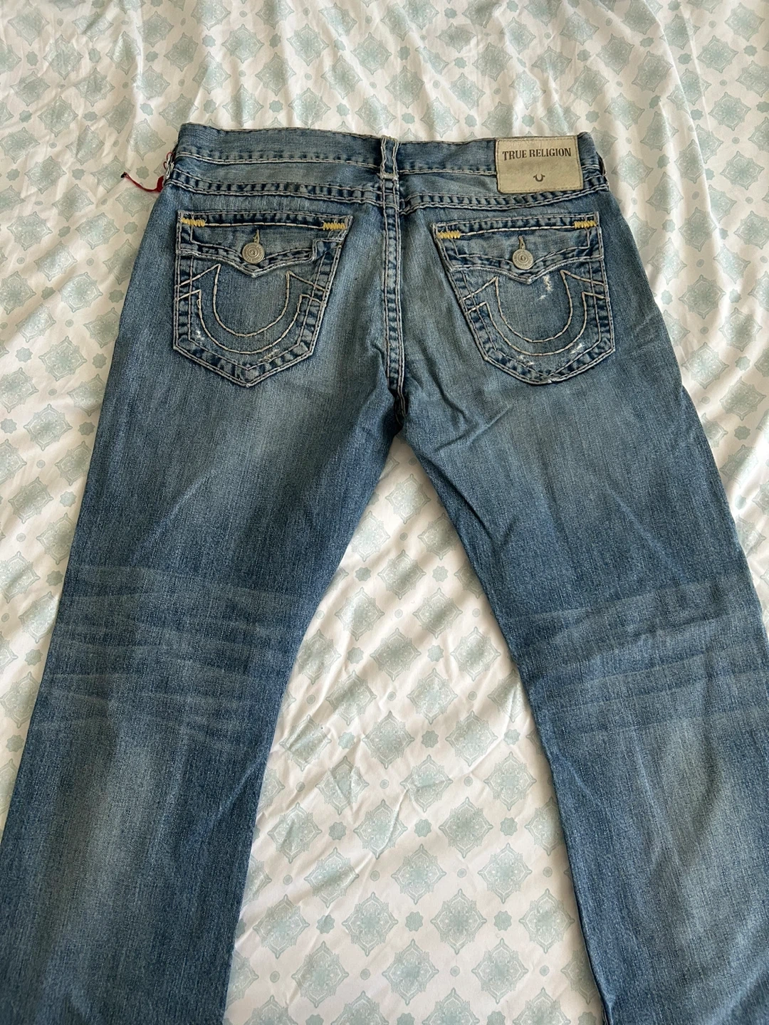 These are distressed blue denim jeans from True Religion. They're a classic straight-leg fit with detailed stitching. Made of 100% cotton.