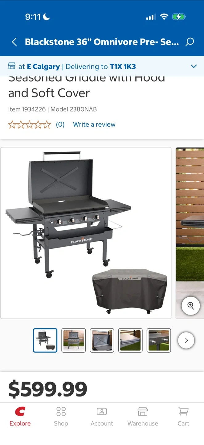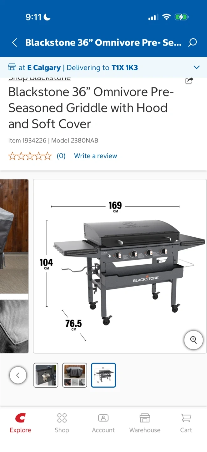 This is a Blackstone 36 inch Omnivore griddle. It includes a hood and a soft cover. Dimensions are 169 cm wide by 104 cm high and 76.5 cm deep. Comes with accessories.