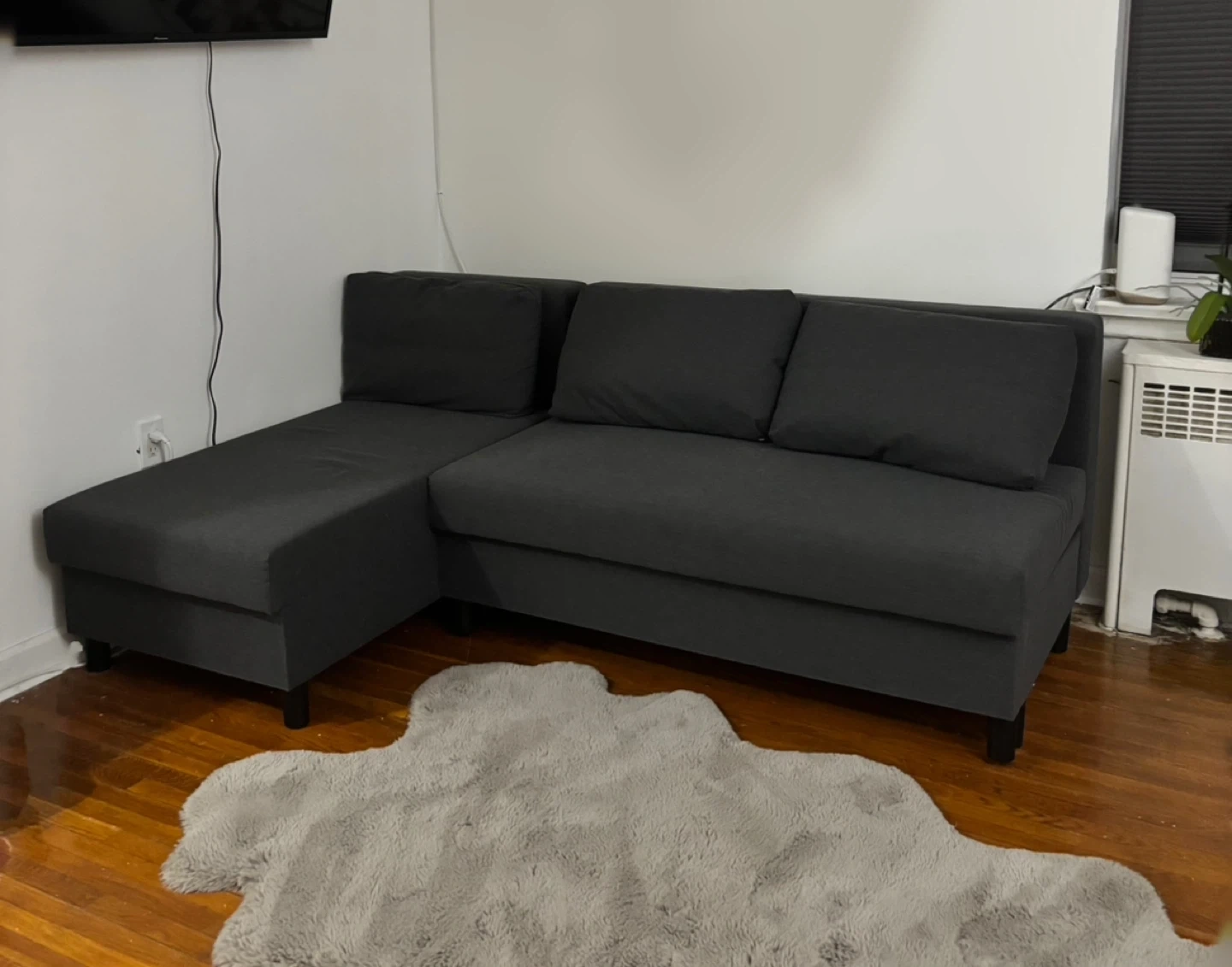 Selling Ikea Friheten sleeper sectional sofa in charcoal colour. It's in great shape and has a convenient storage compartment underneath the chaise. Perfect for small spaces or a guest room!