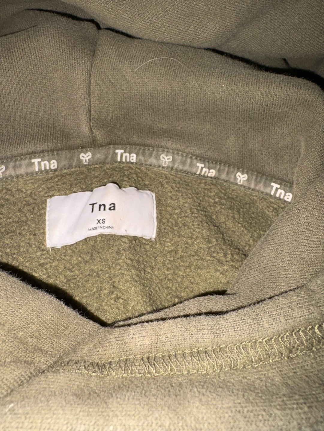 TNA cropped hoodie in olive green. Size XS. This hoodie is made with a soft fleece material, perfect for casual wear.