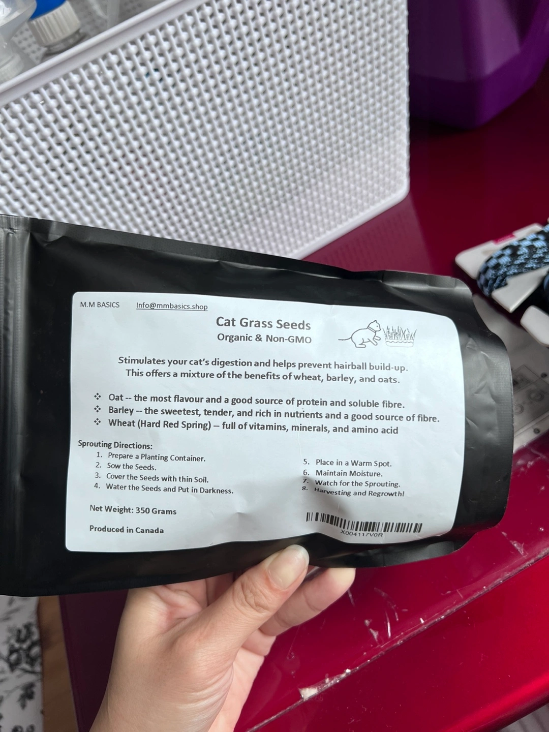 350 gram bag of organic and non-GMO cat grass seeds. Stimulates digestion, helps prevent hairball build-up. A mix of oat, barley, and wheat. Great source of protein, fibre, vitamins, and minerals. Grown in Canada.