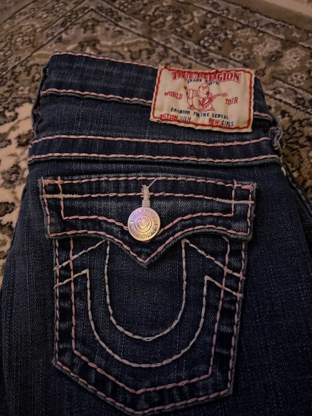 Selling a pair of True Religion jeans. They're in great shape and ready for a new wardrobe! The jeans are a size 14 and feature a stylish design with pink stitching.
