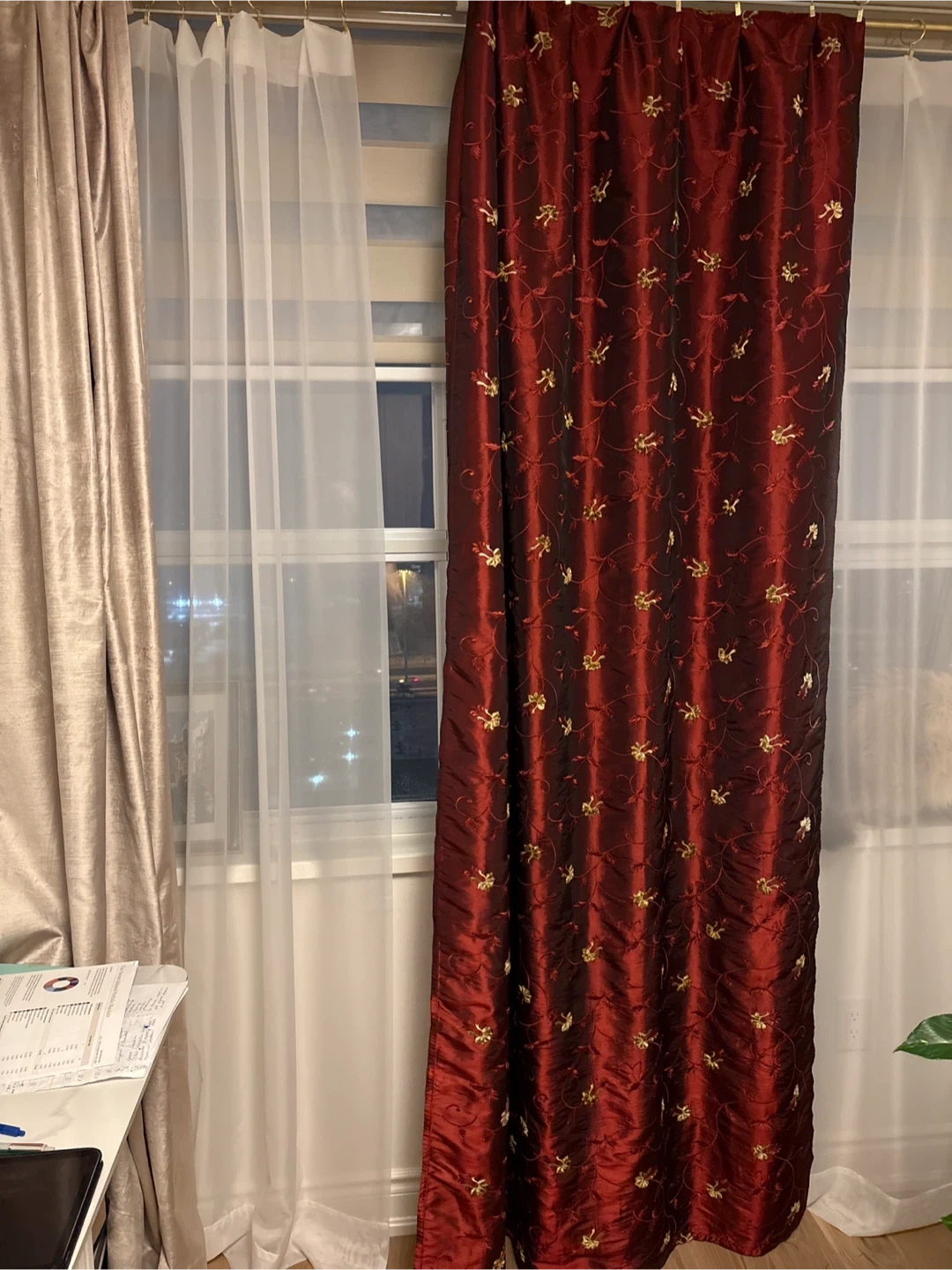 Beautiful burgundy curtain panel with gold embroidery and luxurious sheen! It would add a touch of elegance to any room. The material has a nice sheen and the embroidery is detailed and eye-catching. 57” wide x 92” long Pick up in Etobicoke