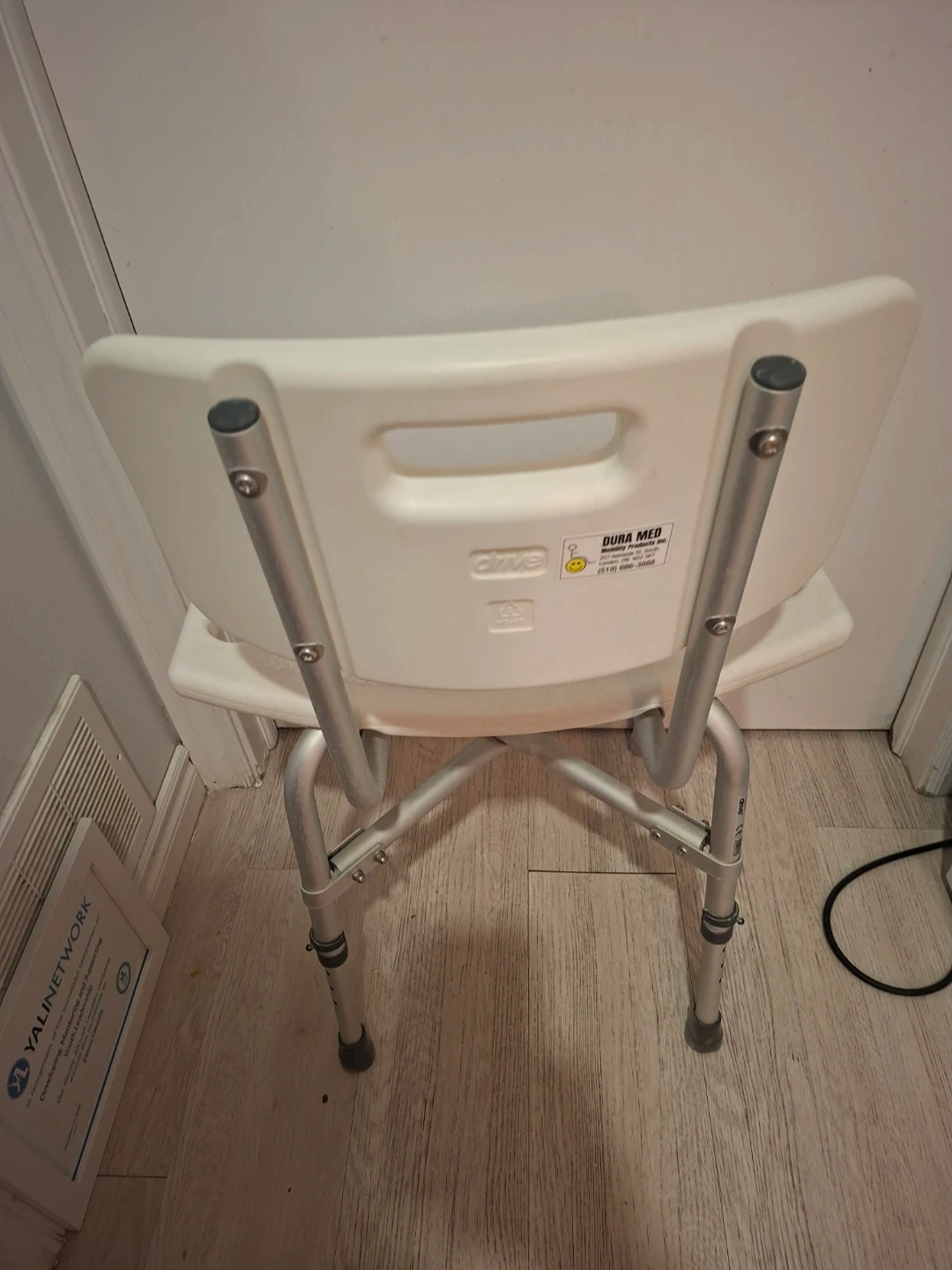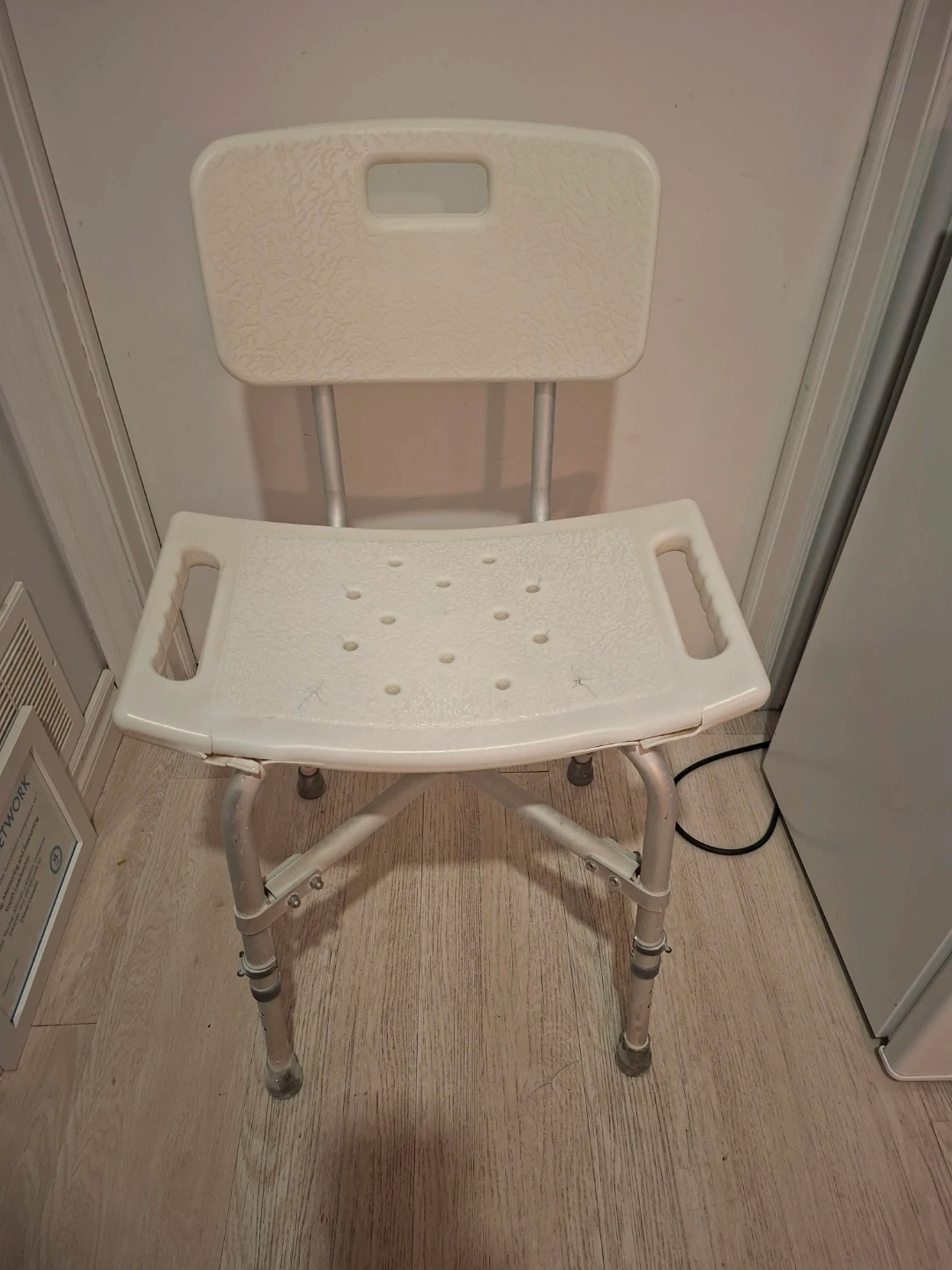 This shower chair by Drive Medical provides support and stability in the shower. It's made of durable plastic and aluminum. The seat features drainage holes and non-slip rubber tips on the legs.