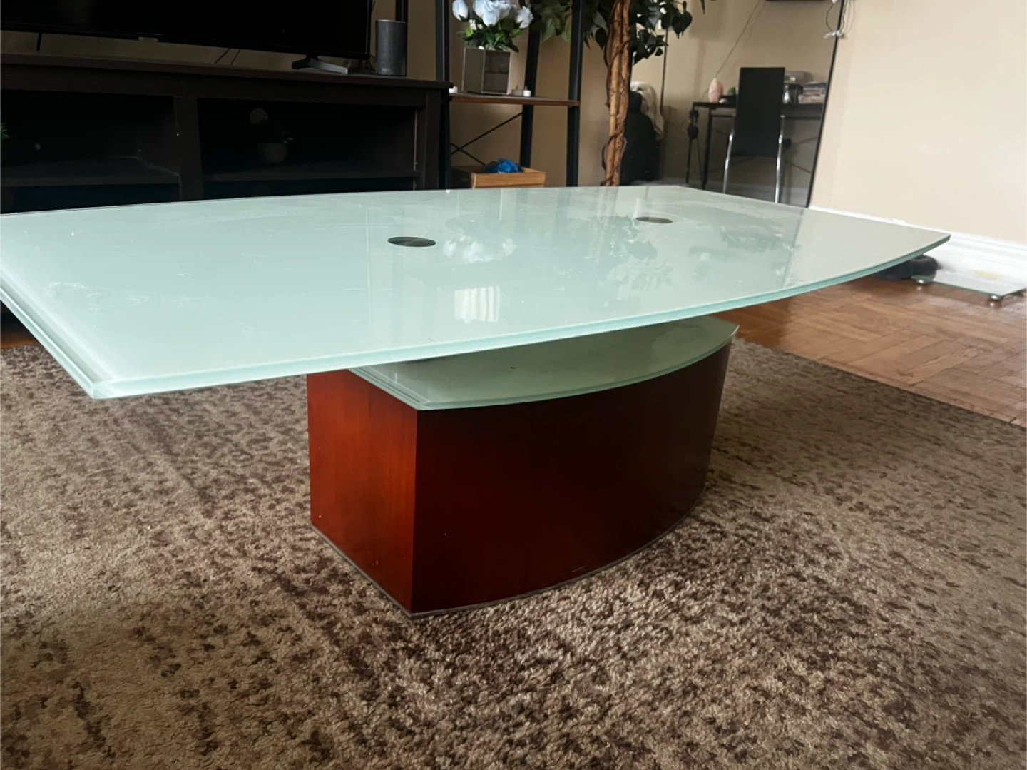 This contemporary coffee table features a frosted glass top and a curved wood base. It's spacious and provides a modern touch to any living room. Perfect for placing drinks or decor items.