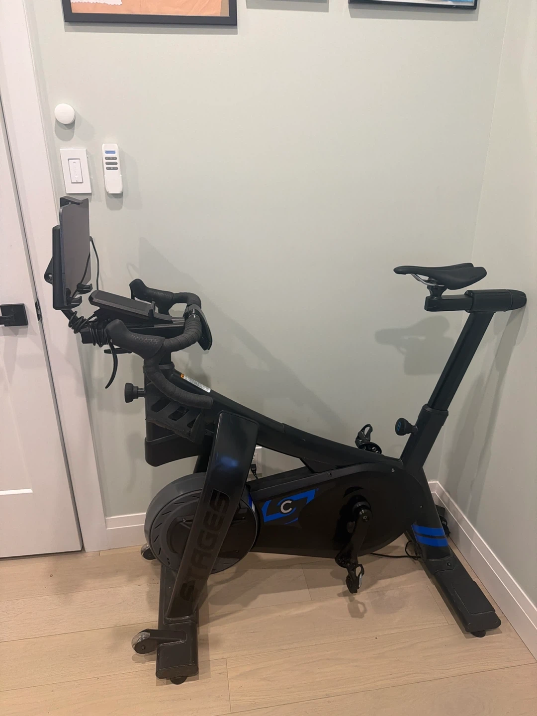 This is a Stages SC1 indoor cycling bike. It features adjustable seat and handlebars for a comfortable ride. The bike is black with blue accents and includes a tablet holder. Perfect for home workouts!
