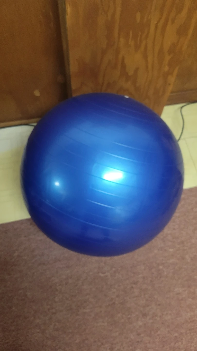 This is a blue Fitness Essentials exercise ball. It comes with an instructional DVD. The ball is made from durable material for your workouts.