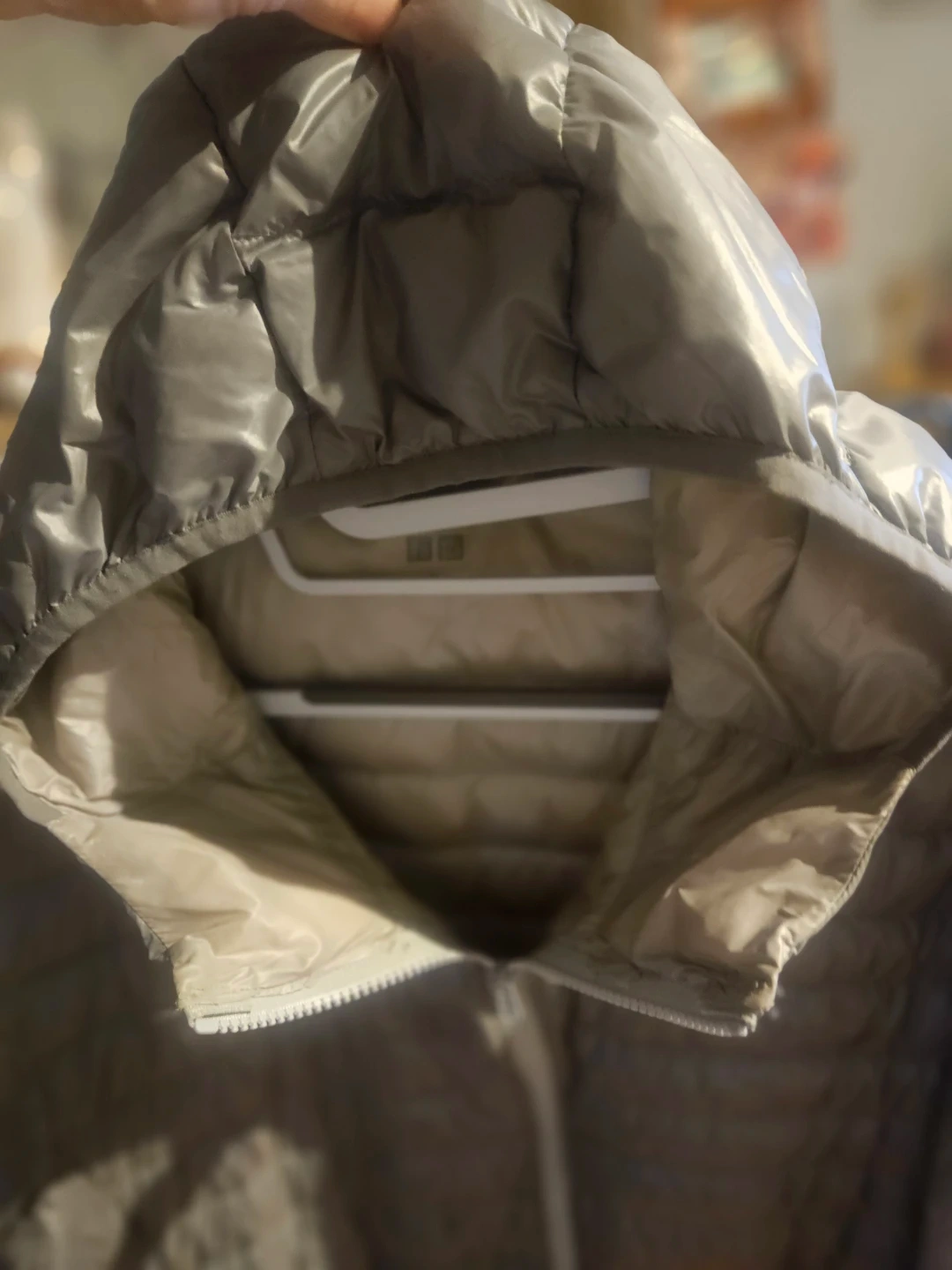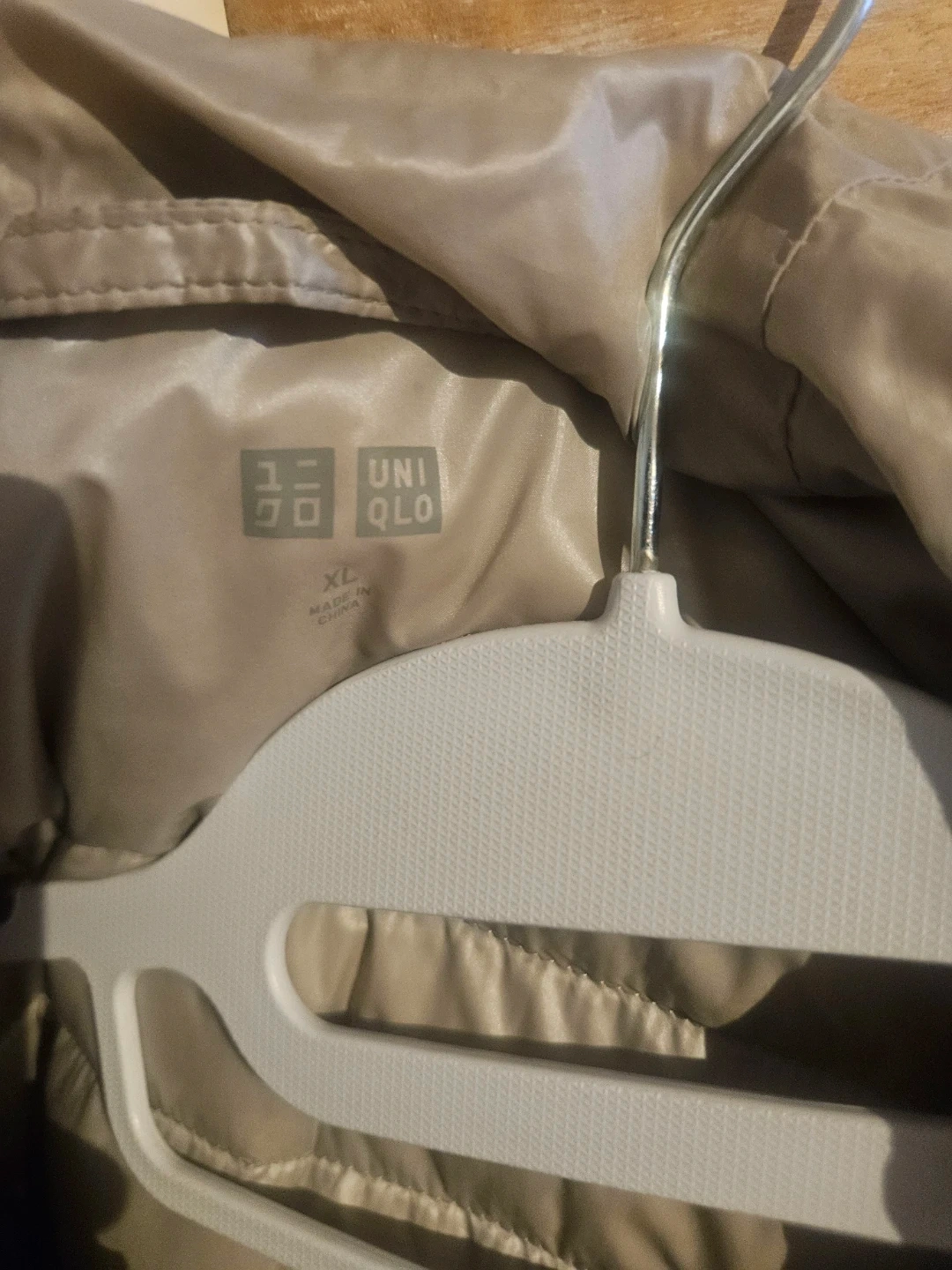 This is a UNIQLO down puffer jacket in size XL. It's a lightweight, packable puffer with a hood. Outer shell and lining are polyester.