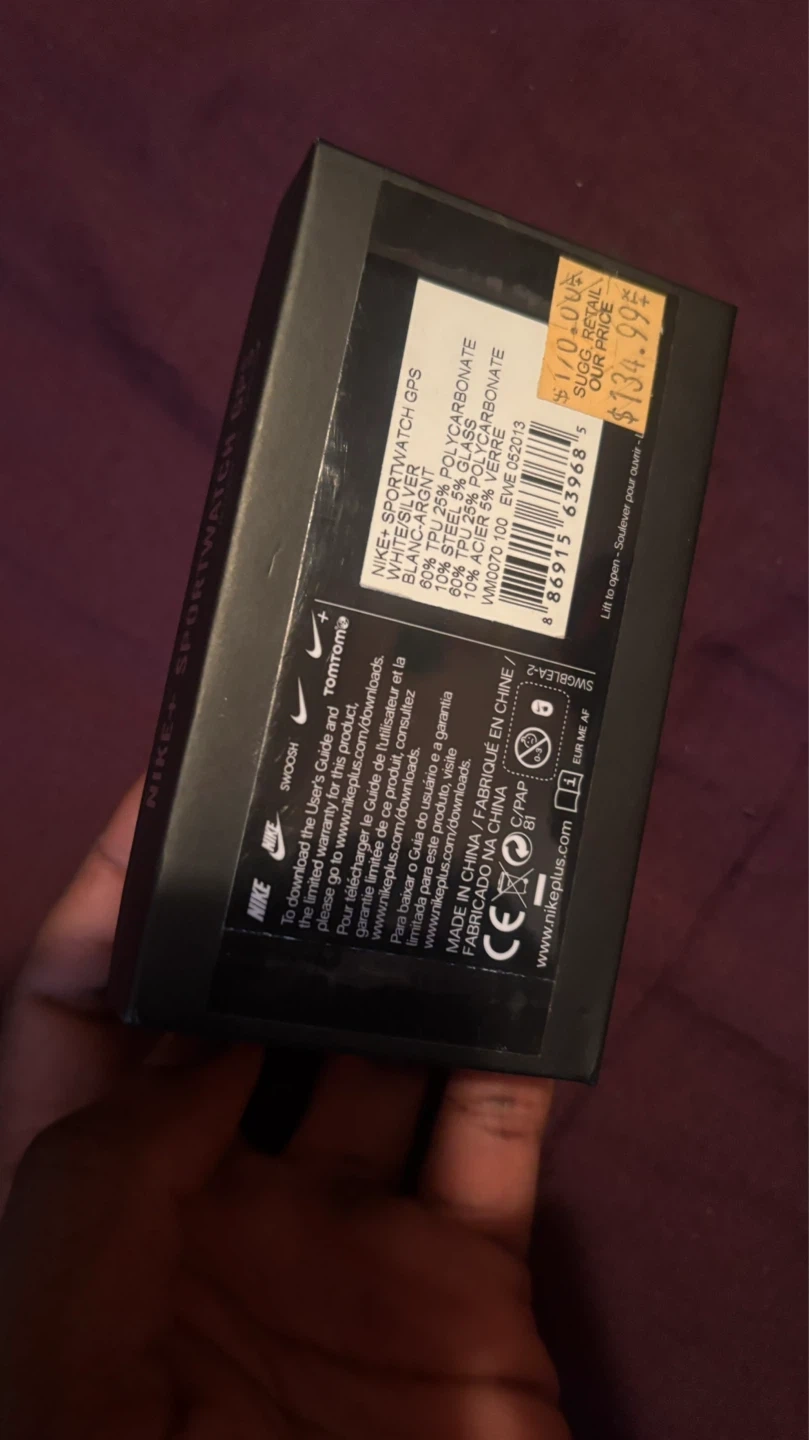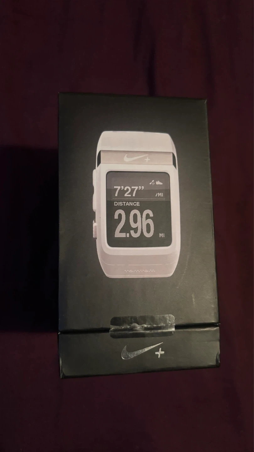 This white Nike+ Sportwatch GPS is powered by TomTom. It tracks distance and has a built-in GPS. Original retail price was $170.00, with a sale price of $134.99.