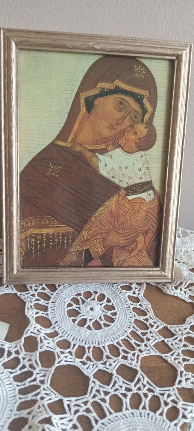 A framed icon depicting the Virgin Mary and child. The image has a crackled finish with gold accents and is housed in a gold-toned frame. It's suitable for display in a home or religious space.