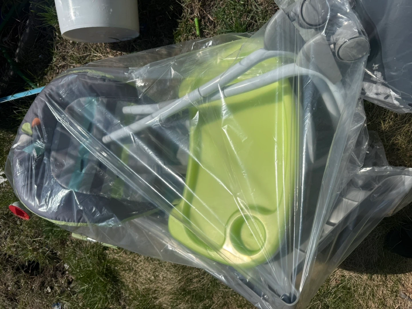 This Graco baby swing features a comfortable seat with grey and green fabric. It has a removable tray and adjustable straps. It's great for soothing babies.