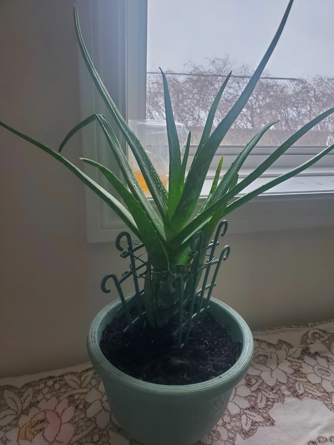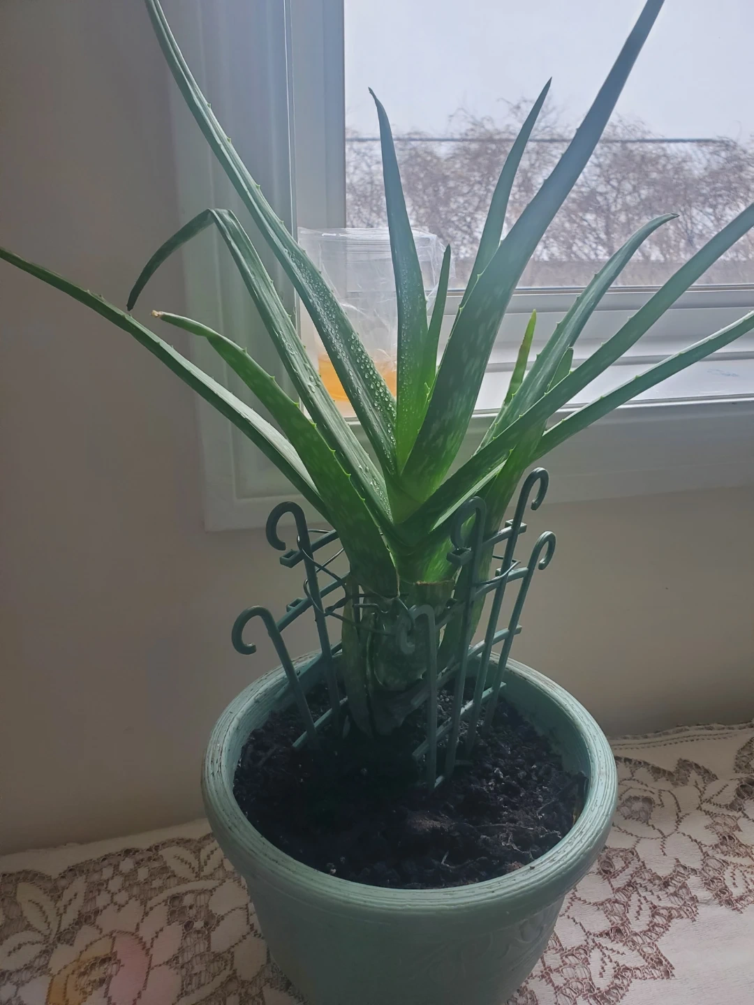 I have an aloe vera plant for sale. It's in great condition and ready to bring some green into your space! The plant comes potted and with a decorative support structure.