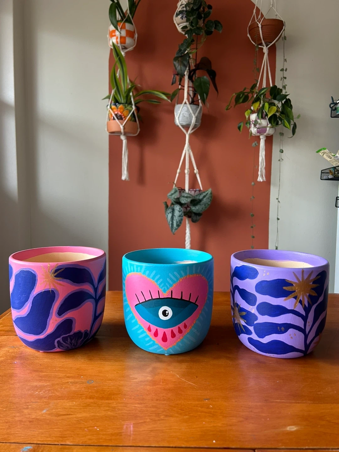 Three unique ceramic planters, each hand-painted with vibrant designs. They're perfect for adding a pop of colour to your indoor plants. Each planter is about 5 inches tall and 5 inches wide.