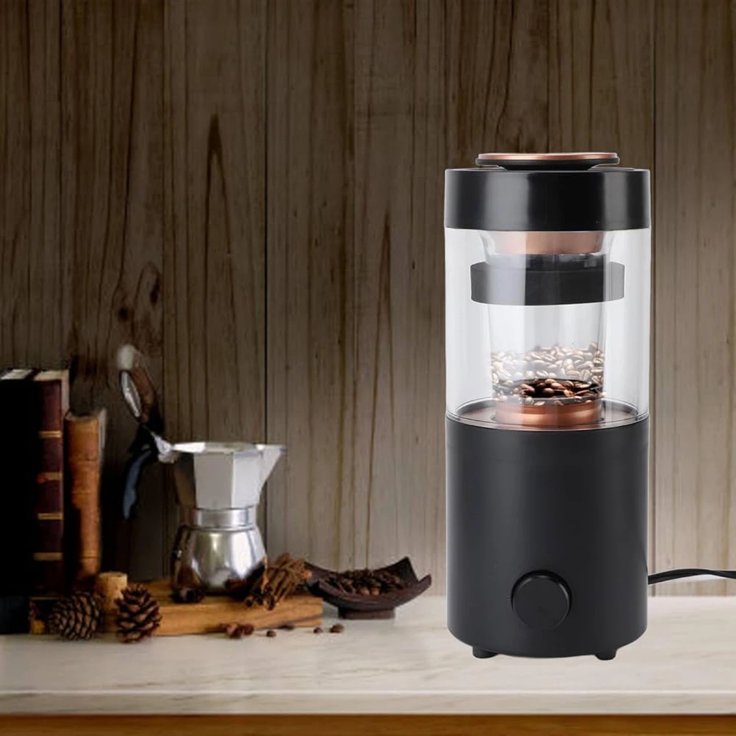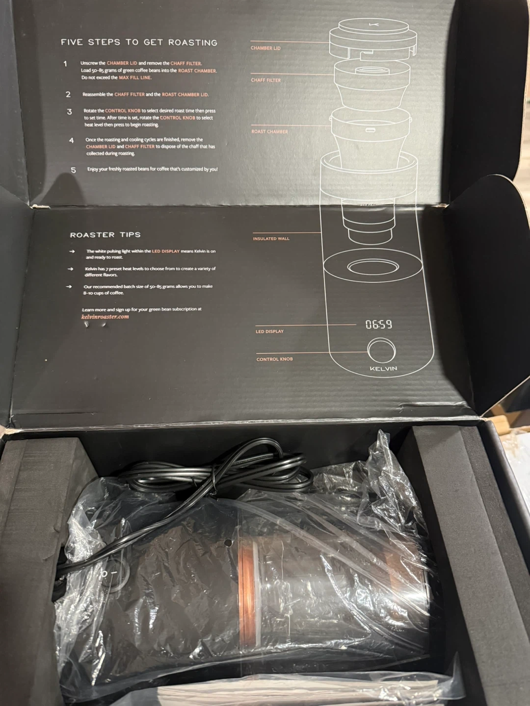 This brand new Kelvin coffee bean roaster makes home roasting a breeze. Its compact design holds a good amount of beans for fresh roasts. Easy to use with a single button operation!