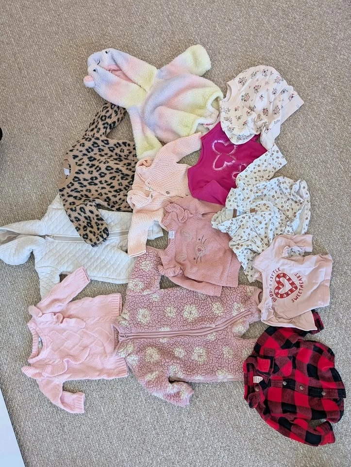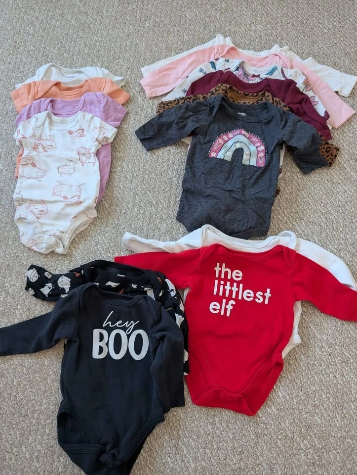 All in very good condition. I can sell all together or pieces. Great for any moms expecting in the fall! 11x pants (2x Christmas, 1x Halloween), 4x sleepers, 6x Christmas sleepers, 10x long sleeve bodysuits (2 Christmas, 2 Halloween), 4x short sleeve bodysuits, 1x Halloween unicorn costume, 8x long sleeve/sweaters, 2x jumpsuits, 1x pink dress sweater. Pickup in Kleinburg (near Major Mackenzie/Highway 27). I have more listings with more sizes and non-clothing items!
