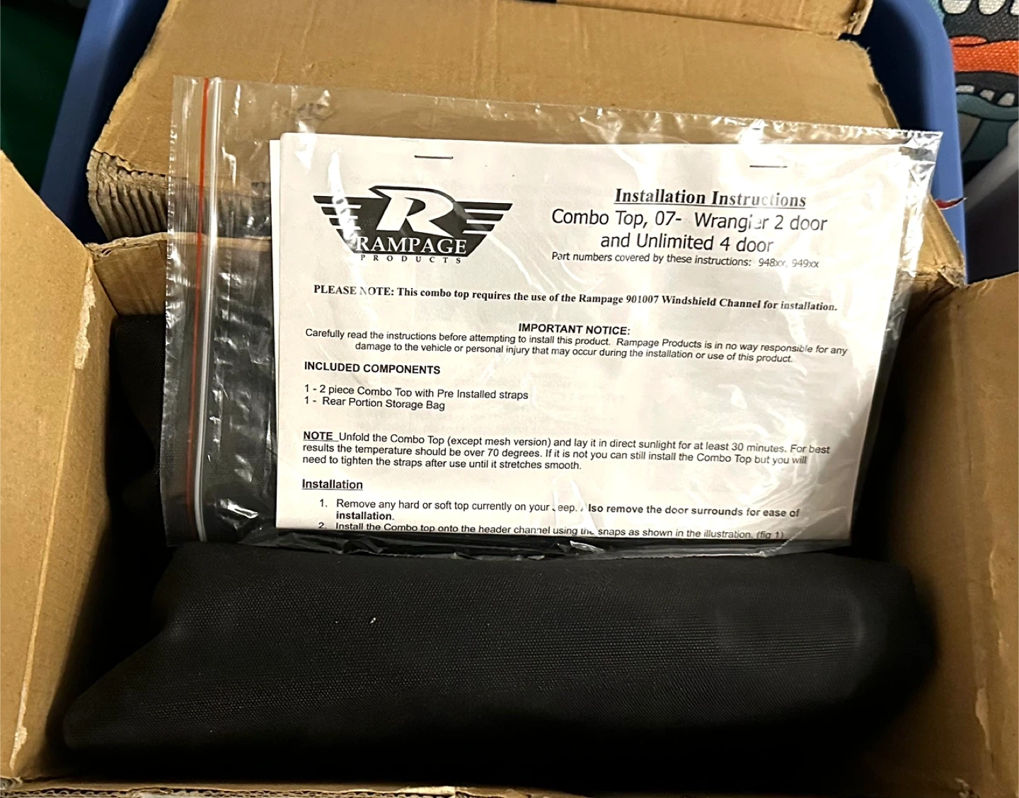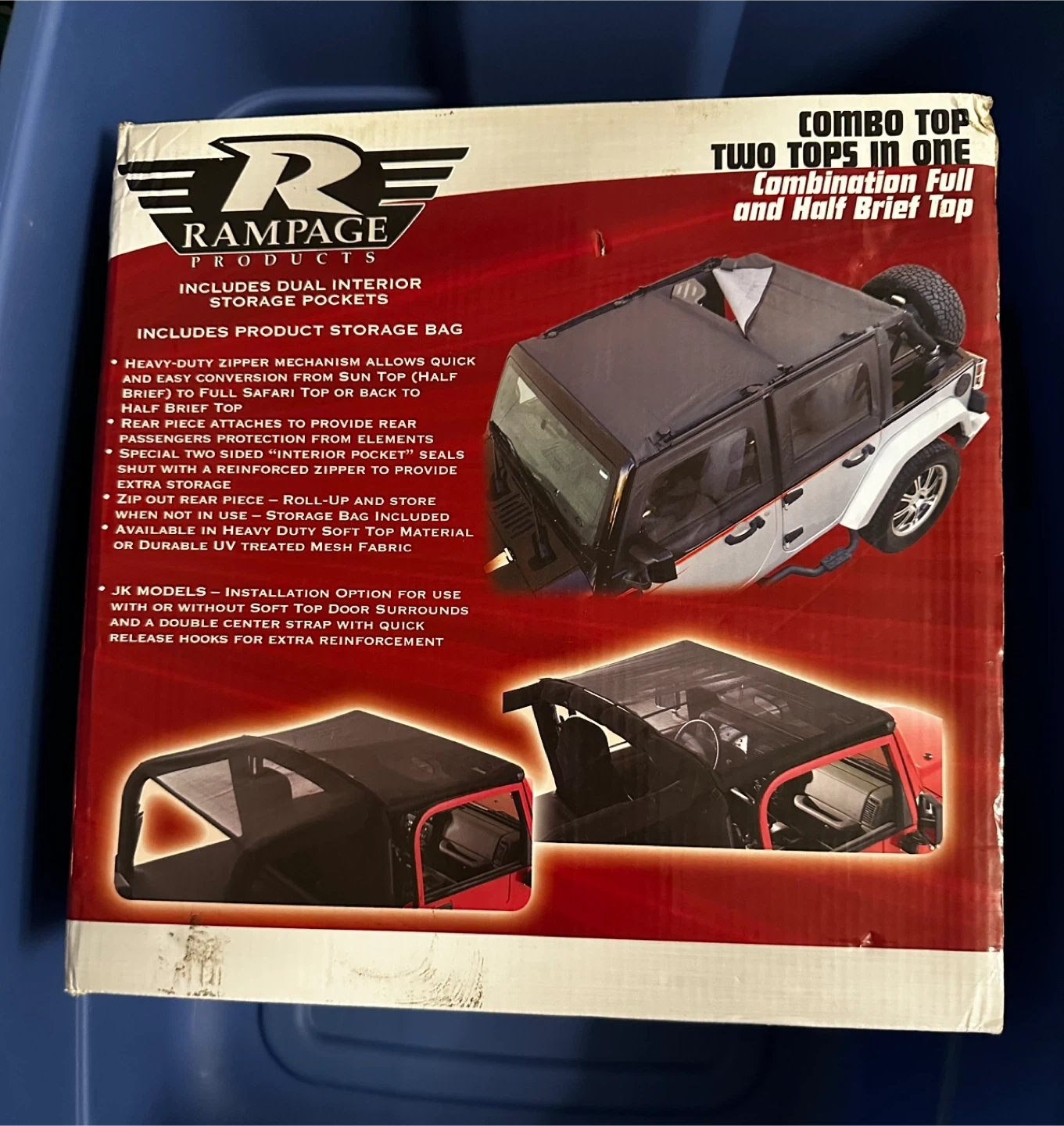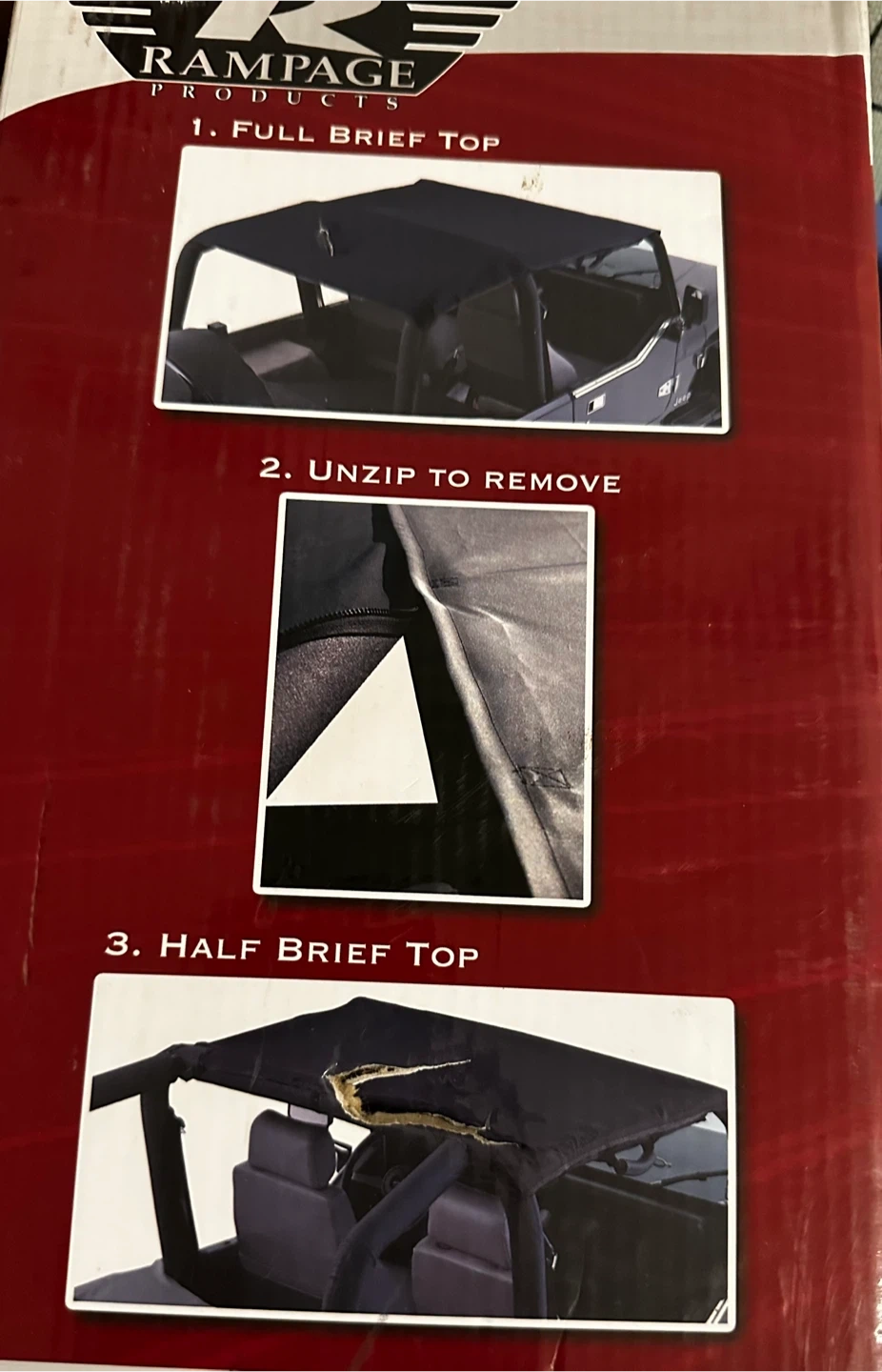 This is a Rampage Products combo top designed for a 07-15 Jeep Wrangler Unlimited. It offers both full brief top and half brief top configurations. Includes interior storage pockets and a product storage bag.