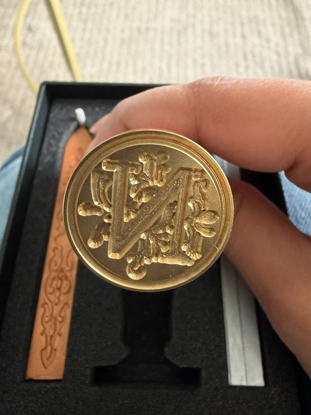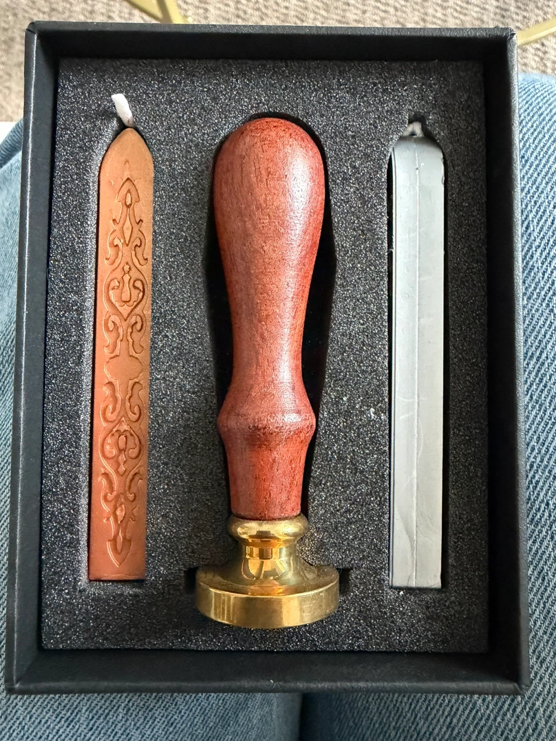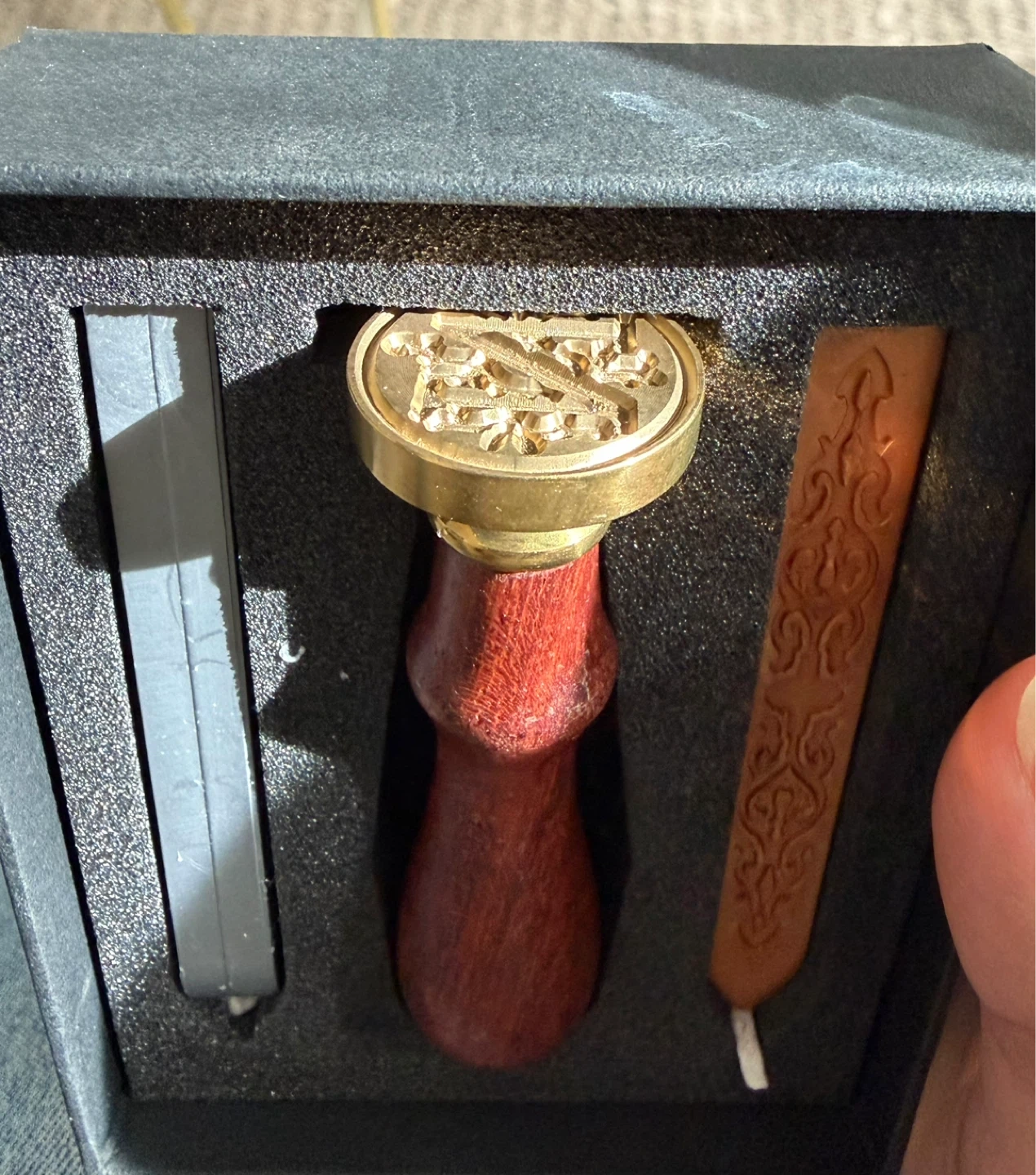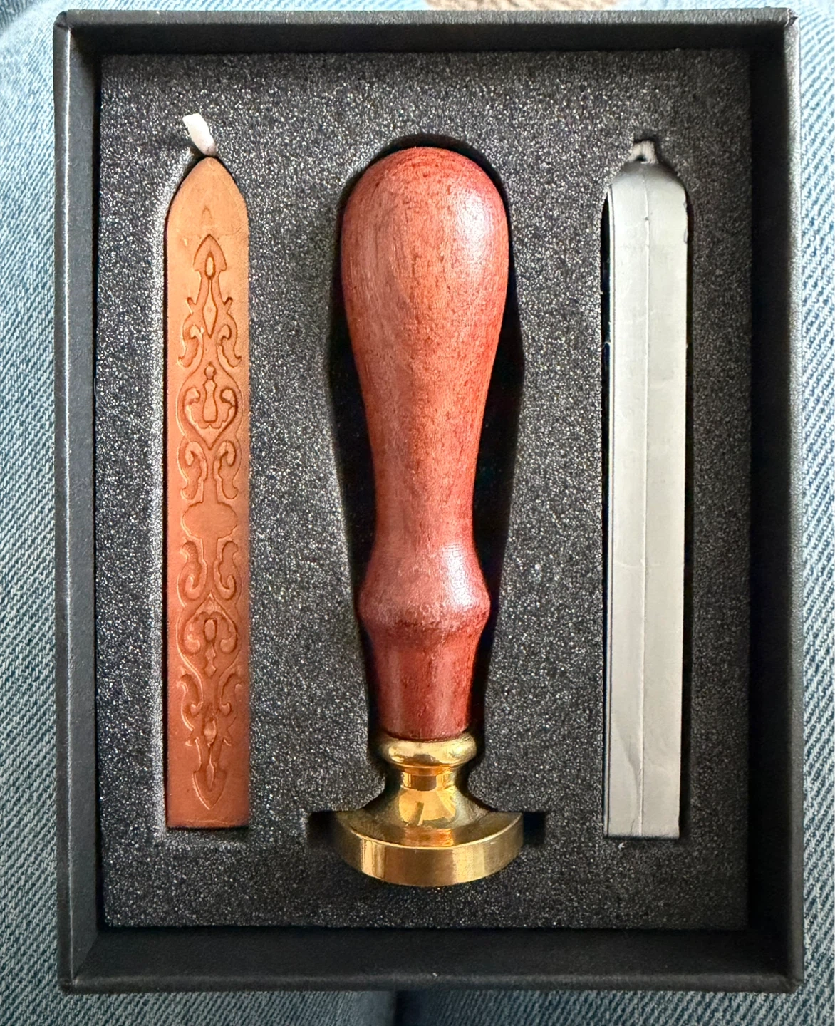 This set includes a wooden-handled wax seal stamp with a decorative 'N' emblem, one copper-coloured wax stick, and one silver wax stick.