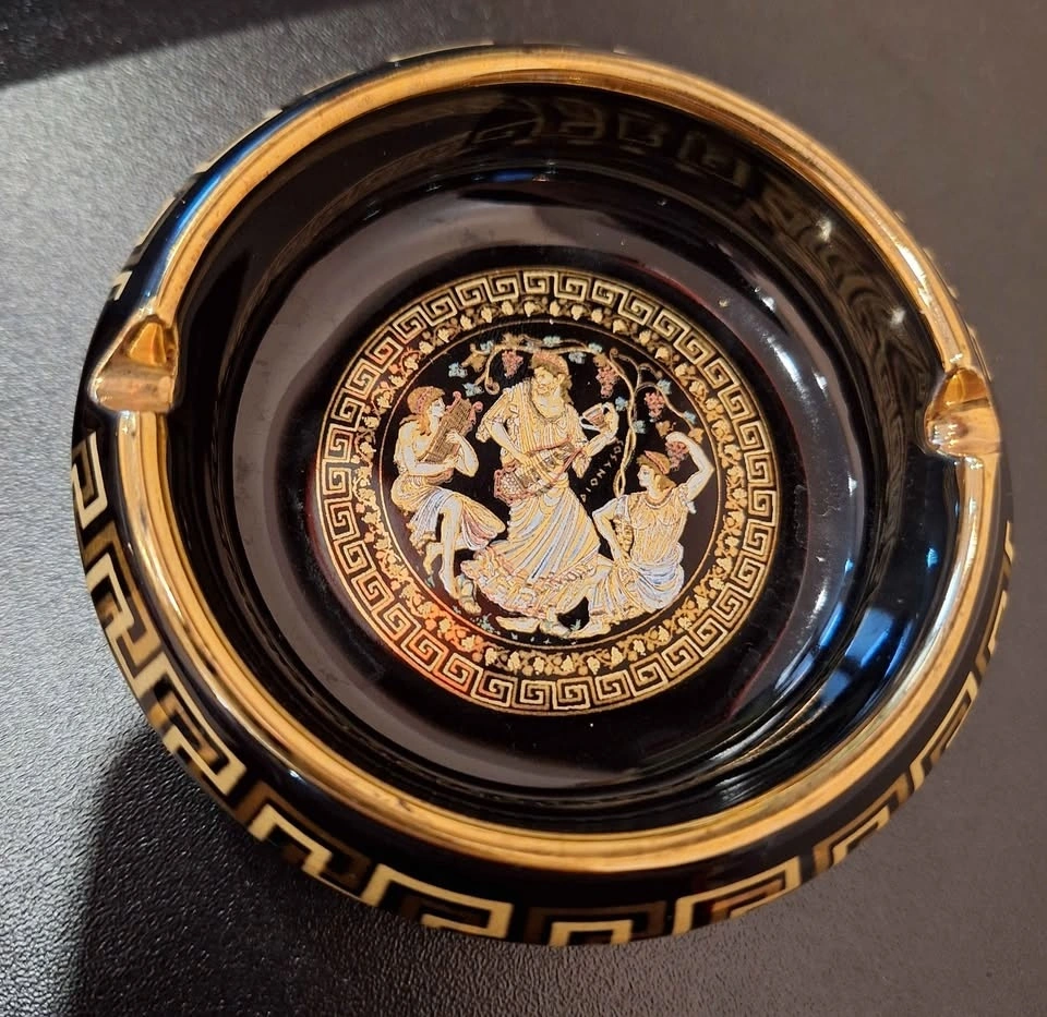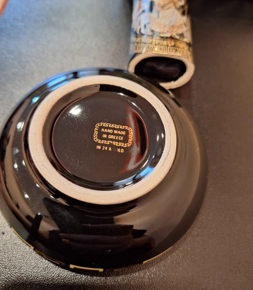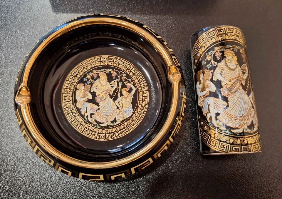 This beautiful vintage Greek ashtray and lighter set by Special Fintias is a stunning example of mid-century craftsmanship. Hand made in Greece and decorated with genuine 24K gold detailing, it features classical ancient Greek motifs with finely painted mythological scenes. Both the ashtray and lighter showcase deep black ceramic glaze adorned with intricate gold Greek key borders and colorful enamel accents. The imagery captures figures from Greek mythology, reflecting elegance, heritage, and a timeless aesthetic. A sophisticated and decorative set — perfect for collectors of Greek art, vintage barware, or mid-century smoking accessories. Ashtray: 3.5" Diameter. Good vintage condition with minimal signs of age. The gold trim and design remain vibrant and well-preserved.