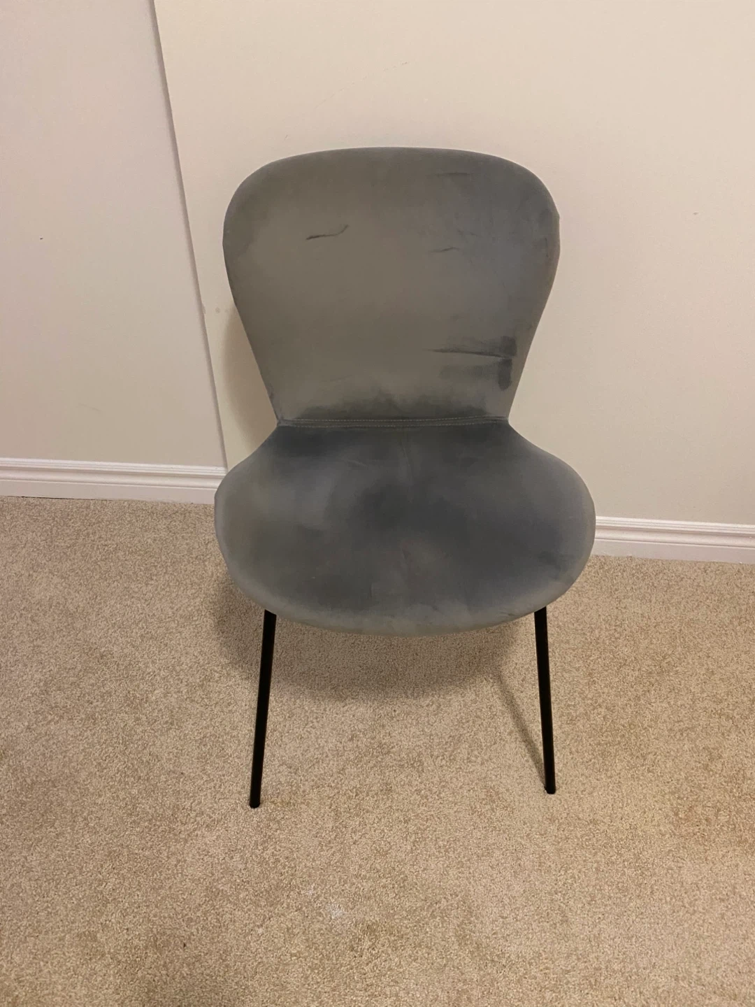 This accent chair is upholstered in a soft grey velvet fabric. It features a curved back and four slim, black metal legs. Its simple design makes it a versatile piece for any room.