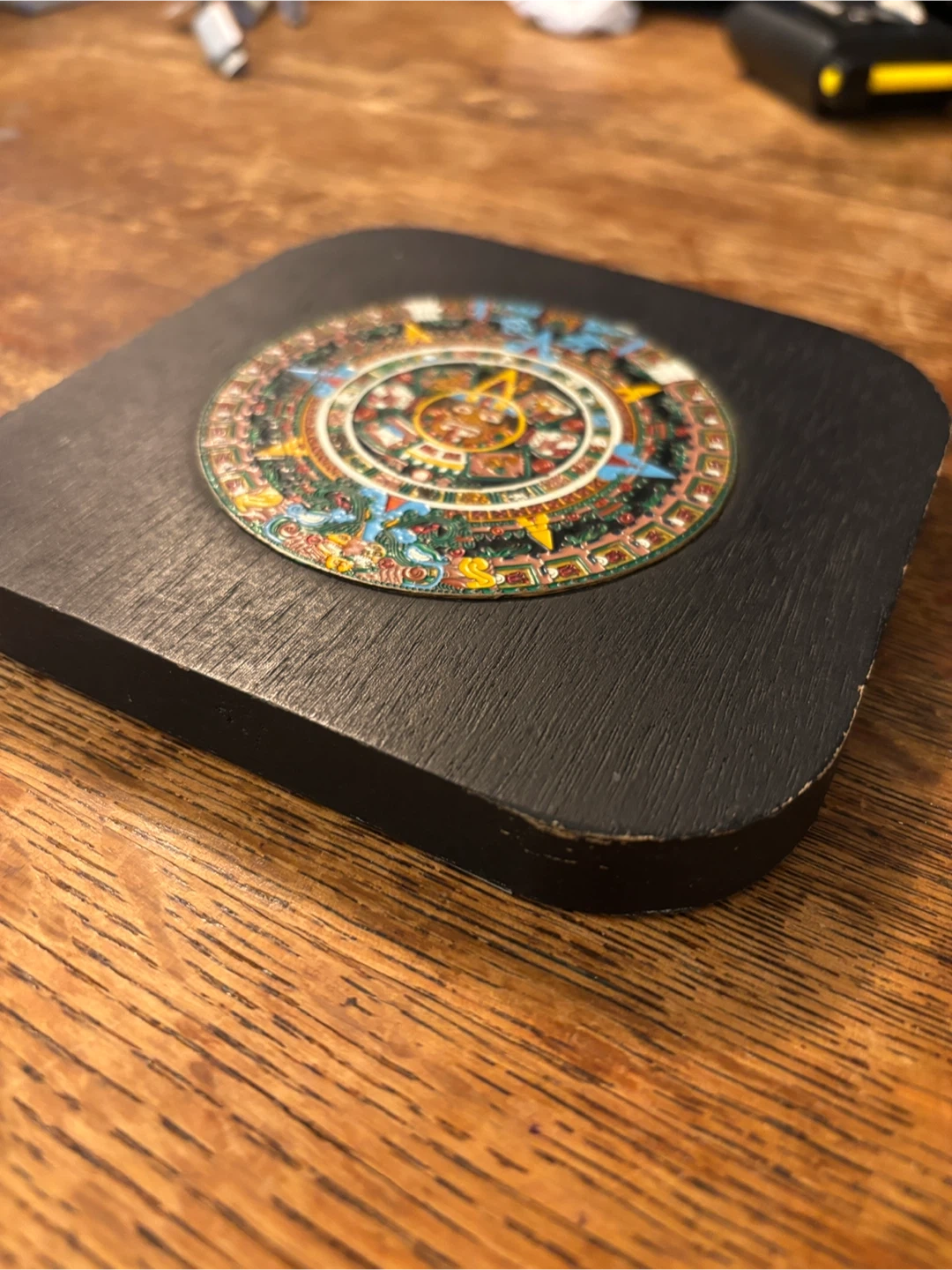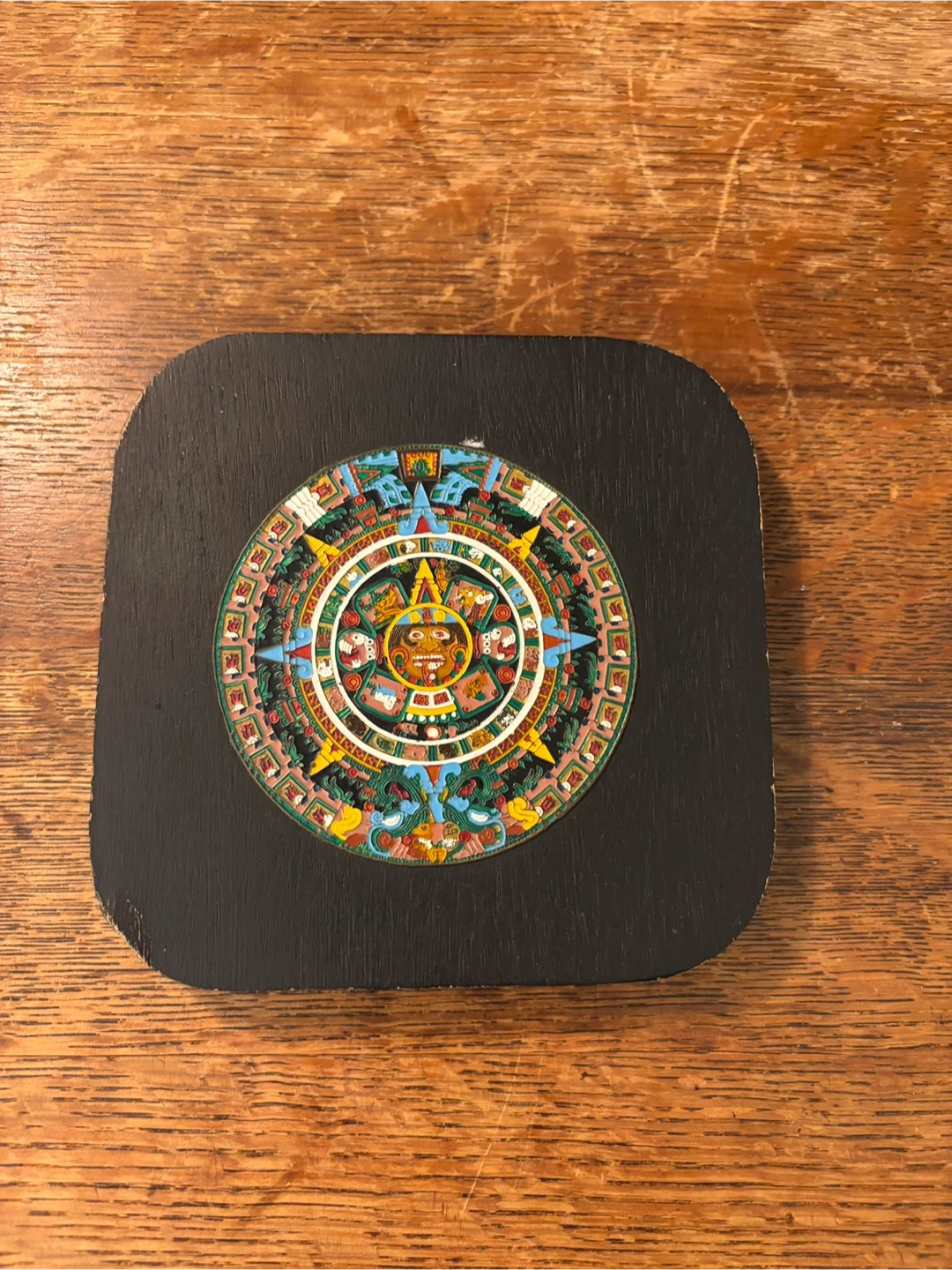 Decorative wall hanging featuring the Aztec Sun Stone Calendar design. The back includes description text. Made of wood with a hager on the back. Vintage condition with some wear on the edge (see pics).