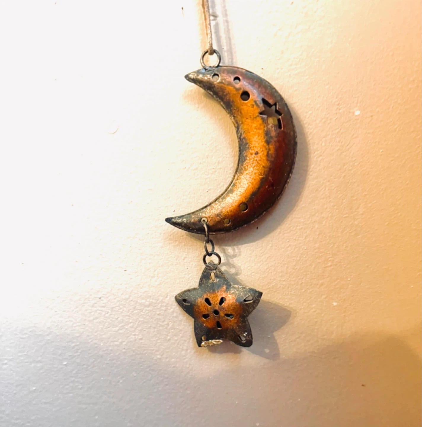 This is a decorative hanging ornament featuring a crescent moon with a star cutout and a dangling star charm. It appears to be made of metal with a distressed, antique-style finish. Perfect for adding a whimsical touch to a room!