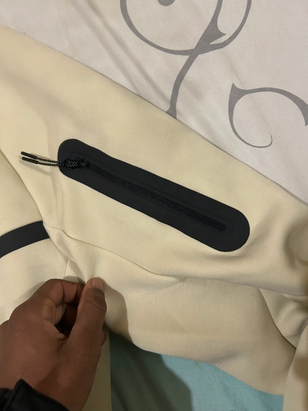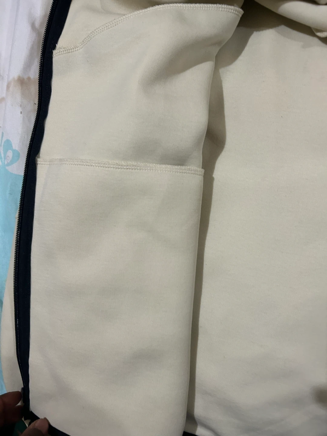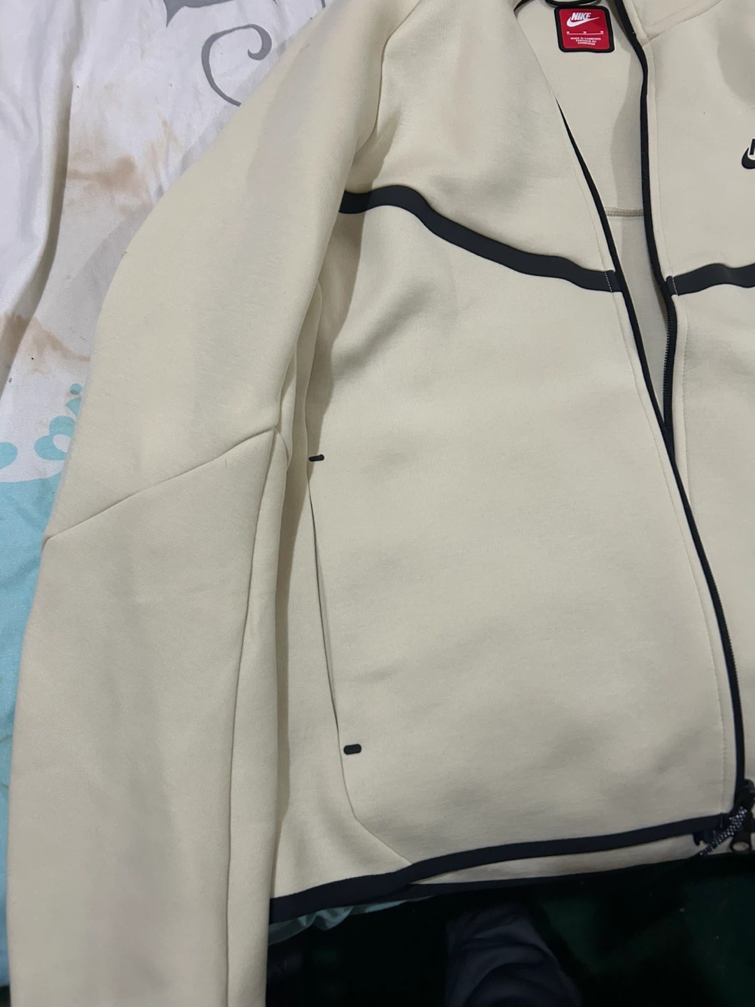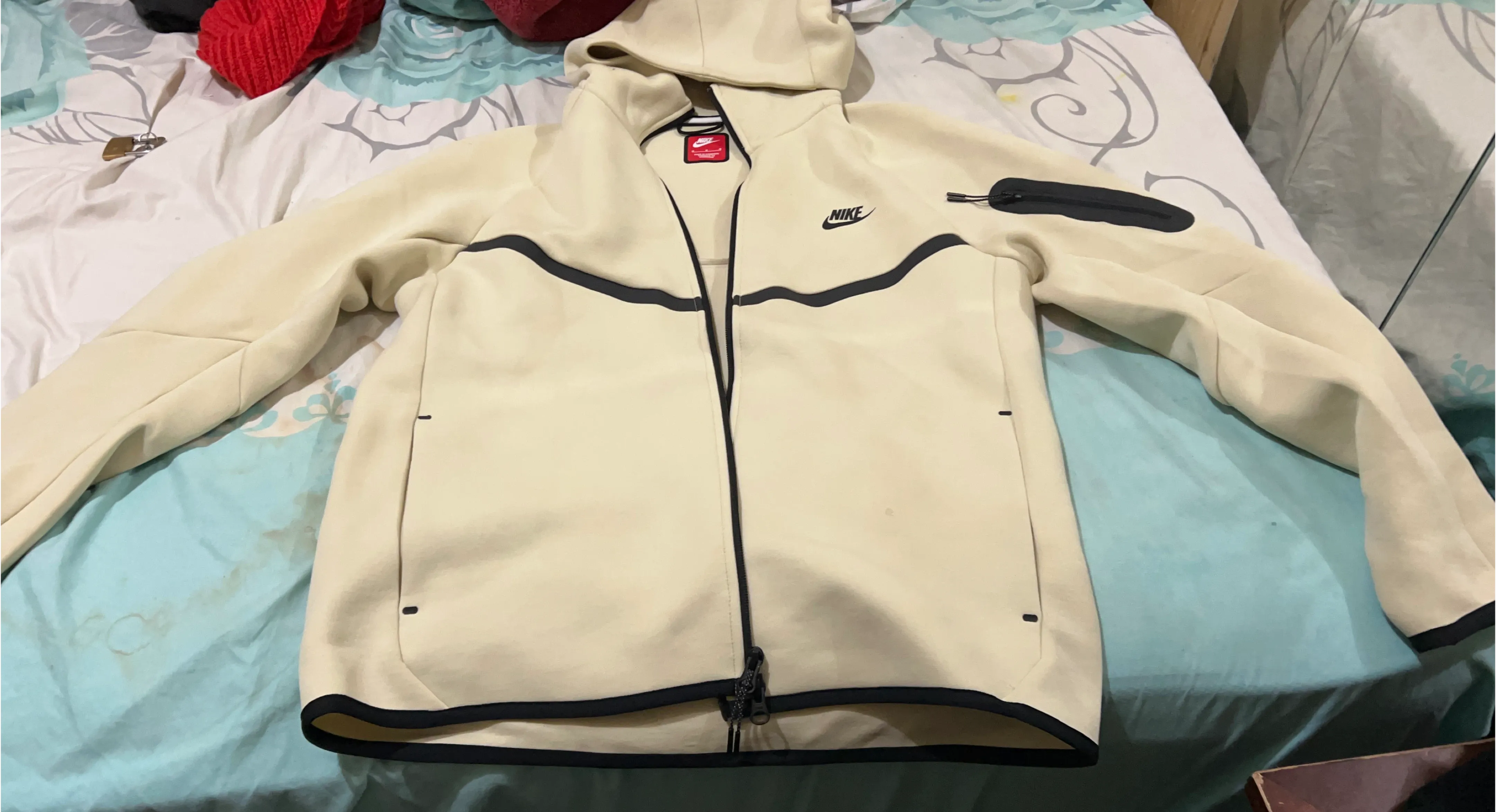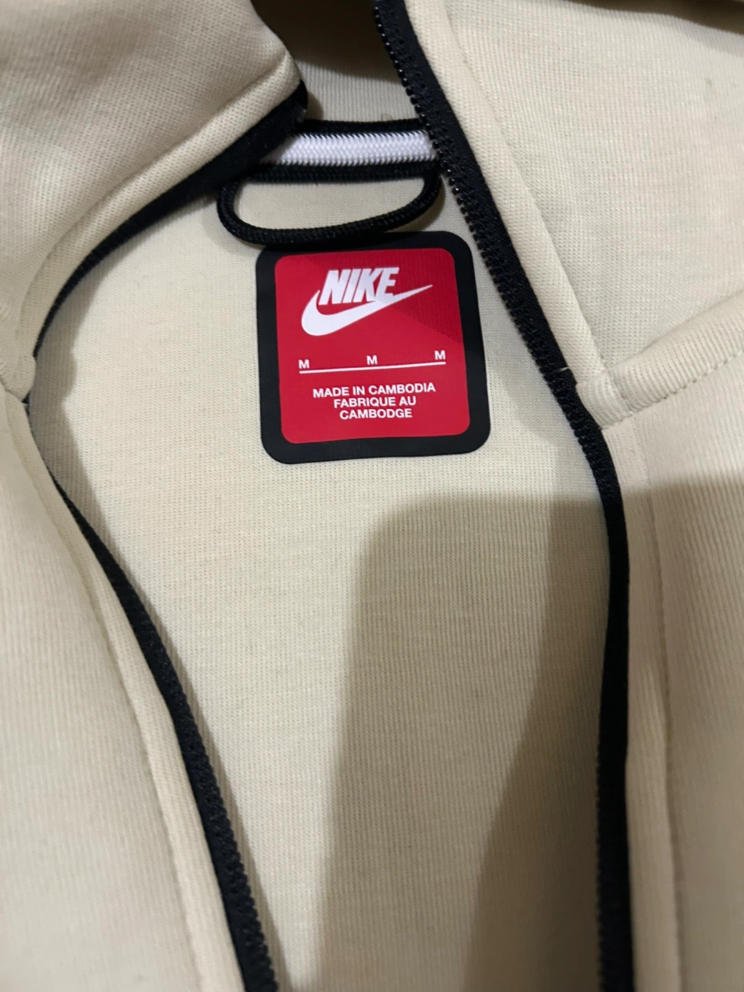 This is a Nike Tech Fleece zip-up hoodie in a light cream color. It features the signature Tech Fleece material and a full zipper closure. The hoodie includes multiple pockets for convenience. It's a comfortable and stylish piece for everyday wear.