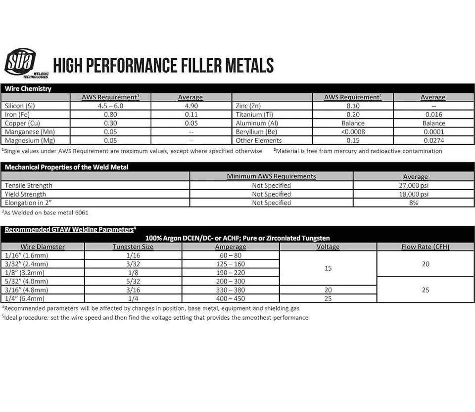 Less sensitive to weld cracking than other aluminum alloys and the 5% silicon content lowers the melting point, increases fluidity of the weld puddle and leaves a bright shiny weld deposit.