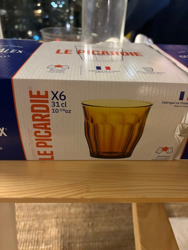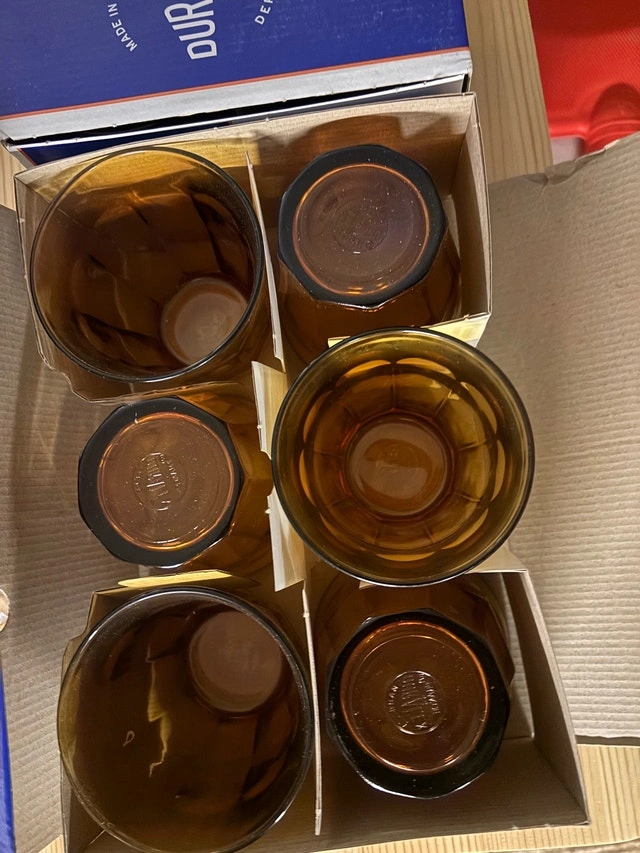 Add a touch of French charm to your table with these Duralex Picardie tumblers! This set of six amber-tinted, 31cl glasses are nearly new, barely having been taken out of the box. These iconic, durable glasses are perfect for everyday use or special occasions. Brand: Duralex, Model: Picardie, Capacity: 31 cl (10 3/8 oz), Colour: Amber, Quantity: 6, Condition: Nearly New. If this ad is still up, yes, they're still available!