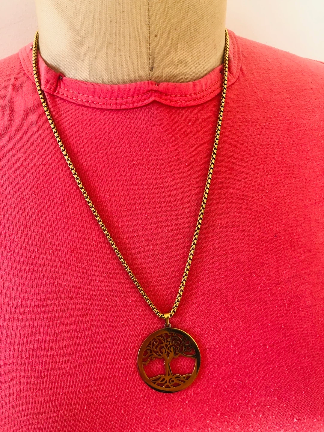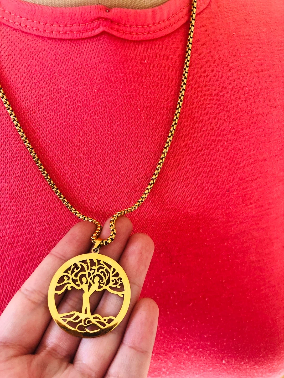 This necklace features a gold-tone pendant shaped like a tree of life. The chain has a classic box link design with a secure clasp. It's a lovely accessory for everyday wear!