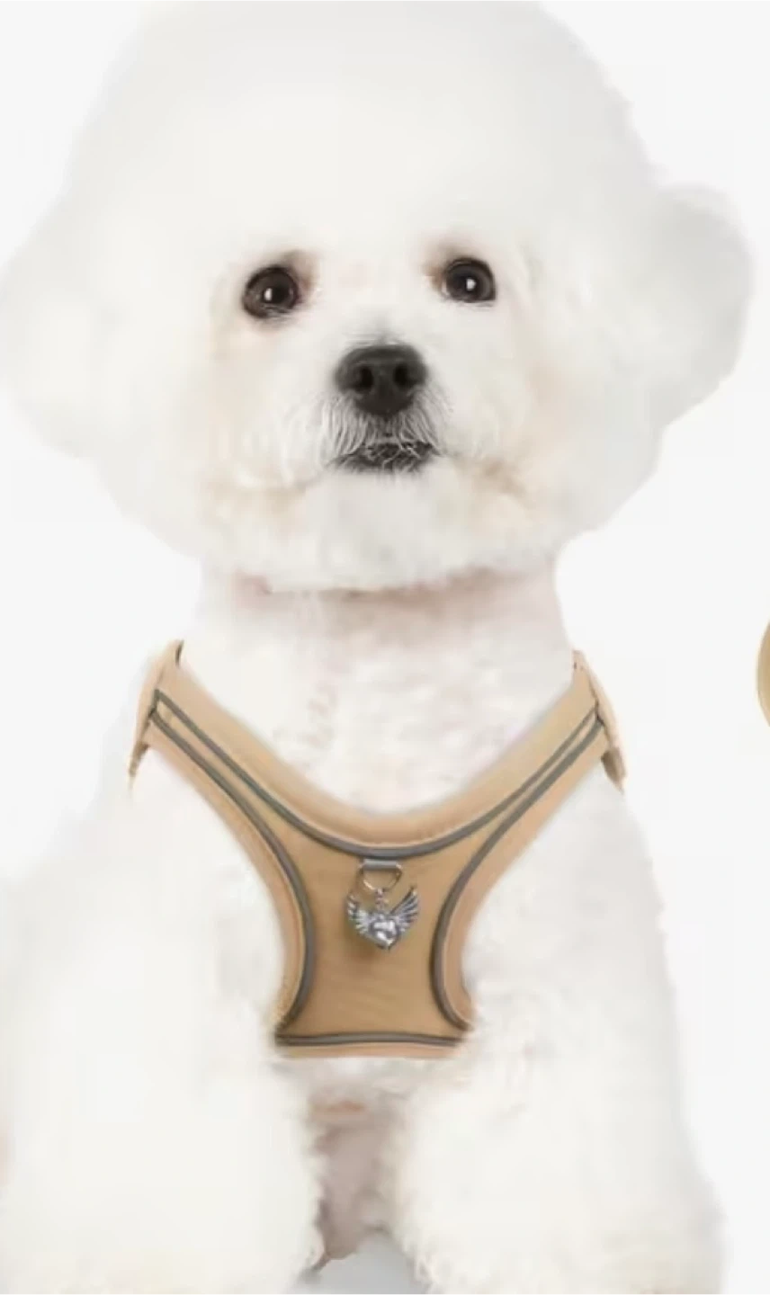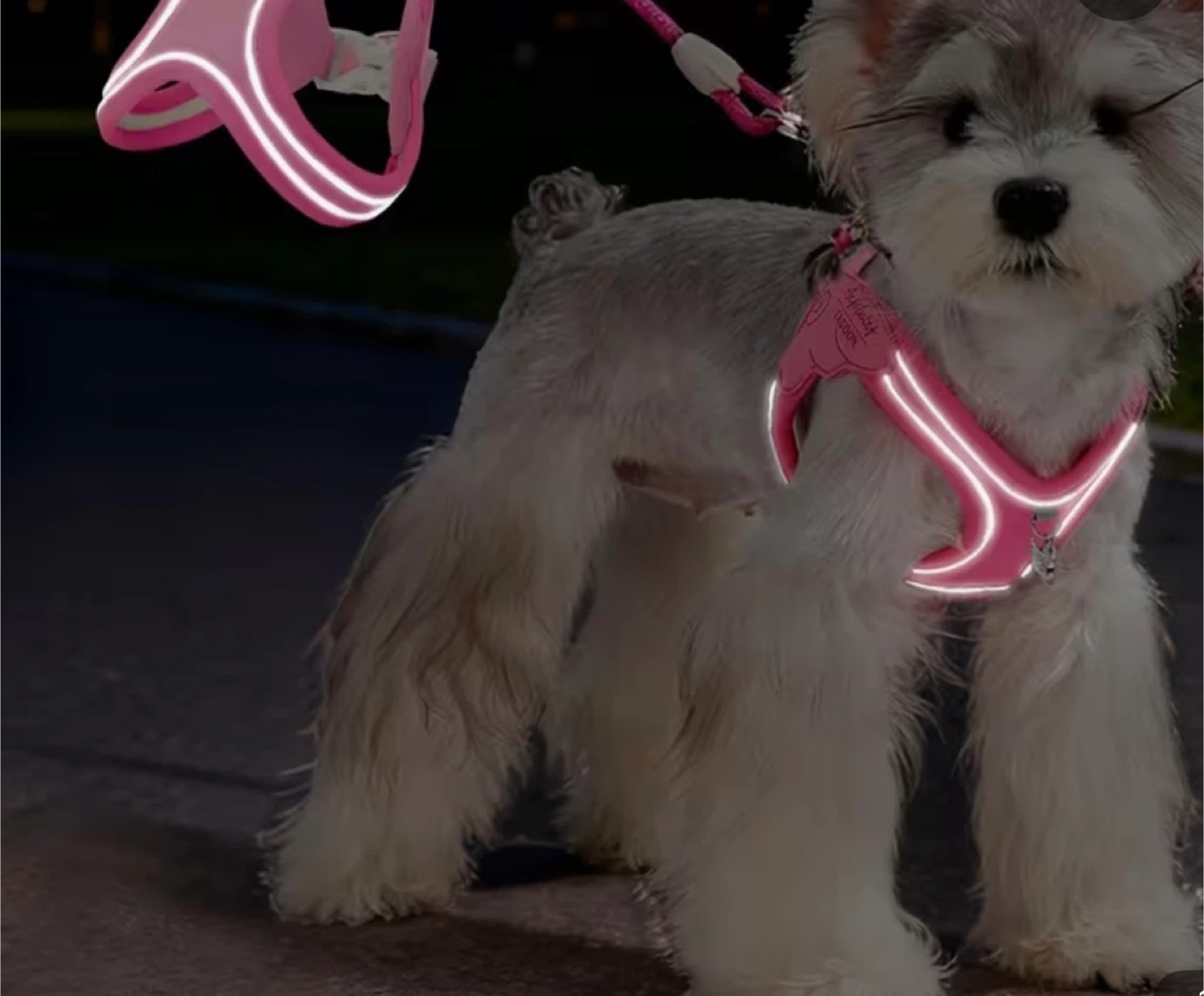 This comfortable pink dog harness features reflective trim for increased visibility at night. It's made from durable material and includes a matching leash. The adjustable straps ensure a secure fit for your pup.