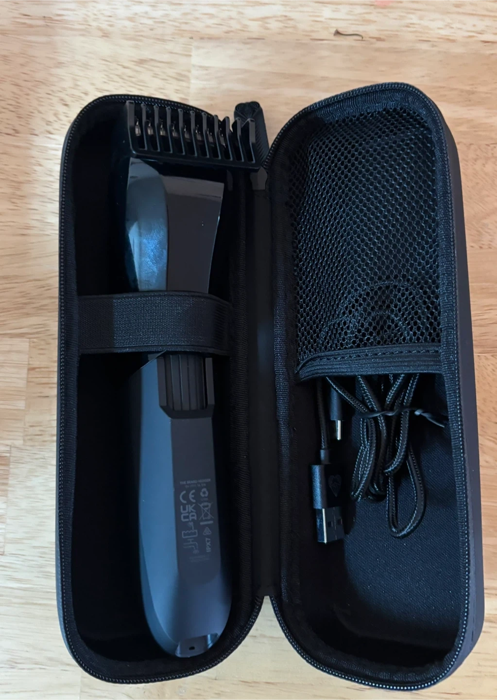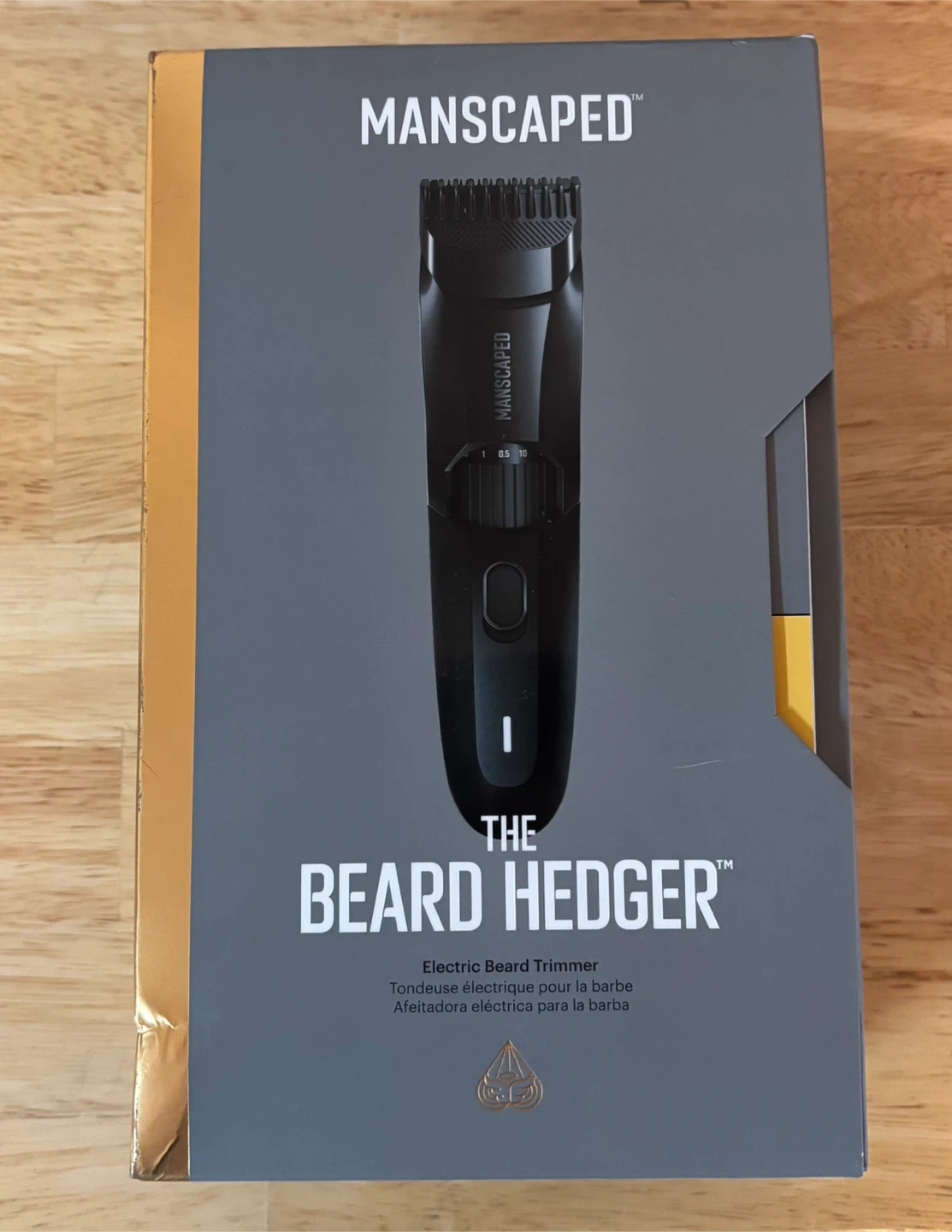 MANSCAPED The Beard Hedger electric beard trimmer. It features a premium ceramic 2.0 skin-safe blade and a rechargeable Li-ion battery. It's waterproof and includes a charging cable and travel case. Perfect for detailed beard grooming!
