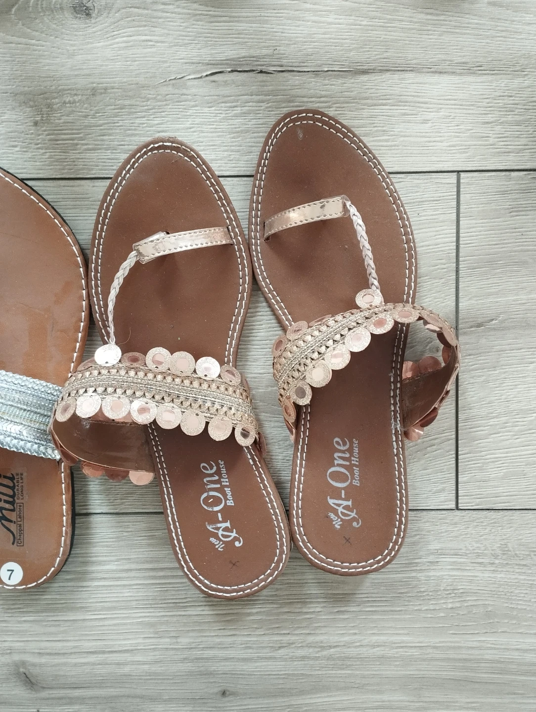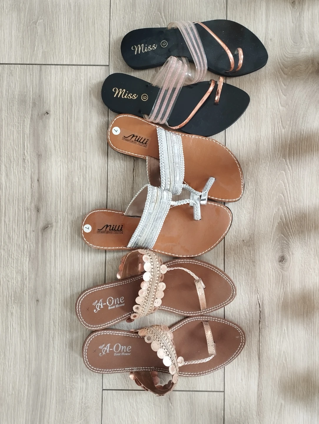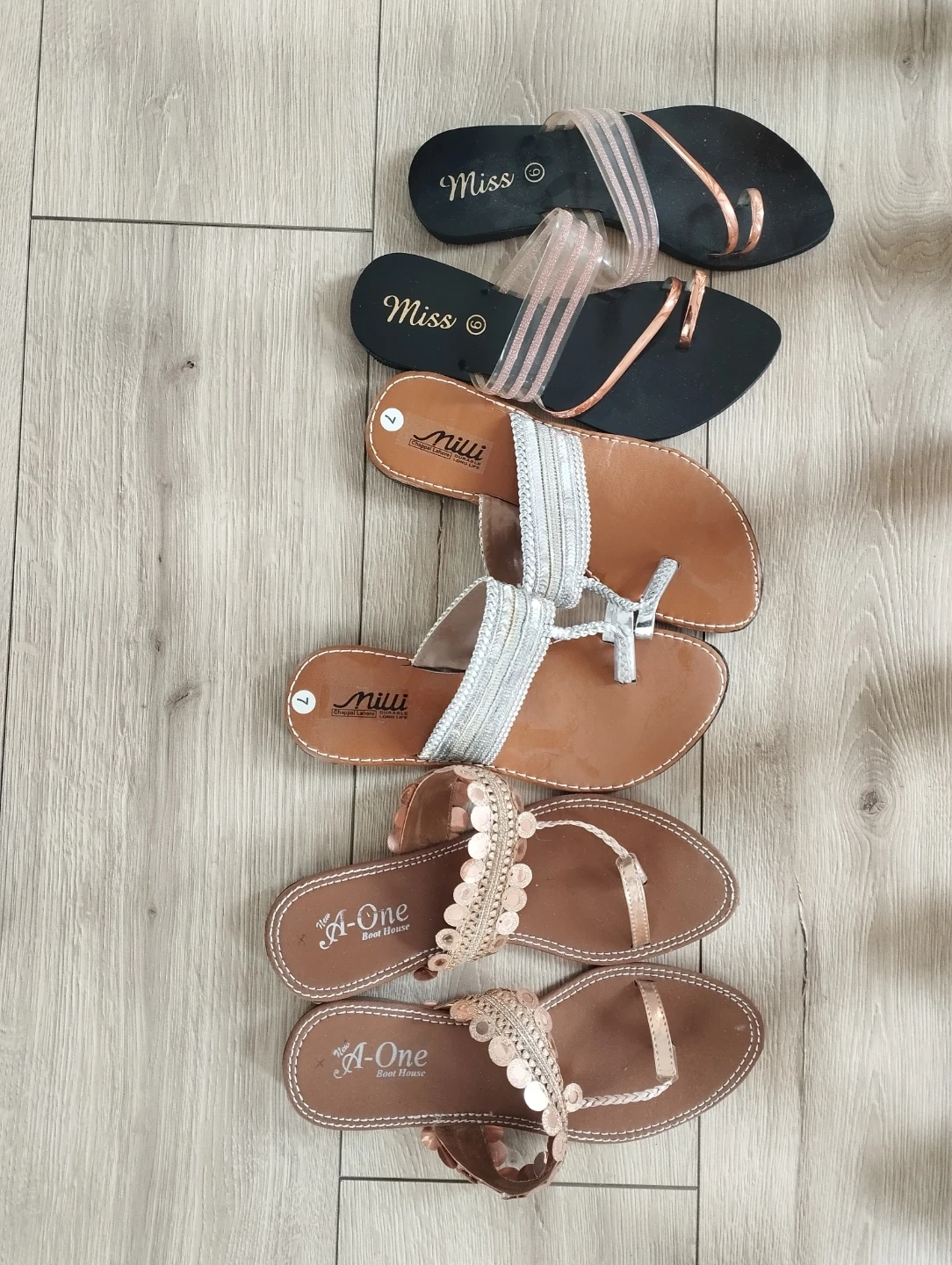Includes three pairs of Miss sandals in black with rose gold accents, two pairs of Milli sandals in tan with silver embellishments, and two pairs of A-One sandals in brown with rose gold trim. Sizes are 7 and 9.