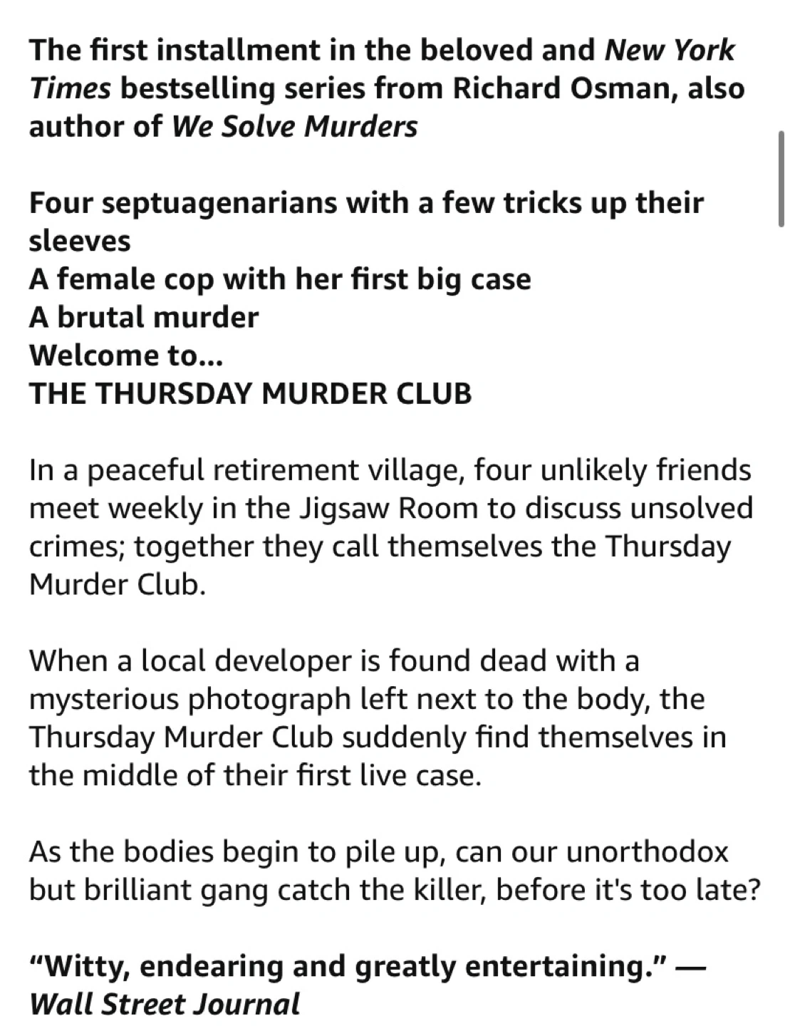 This is the first installment in the New York Times bestselling series by Richard Osman. It follows four unlikely friends in a peaceful retirement village who discuss unsolved crimes, calling themselves the Thursday Murder Club. When a local developer is found dead, the club finds themselves in the middle of their first live case!