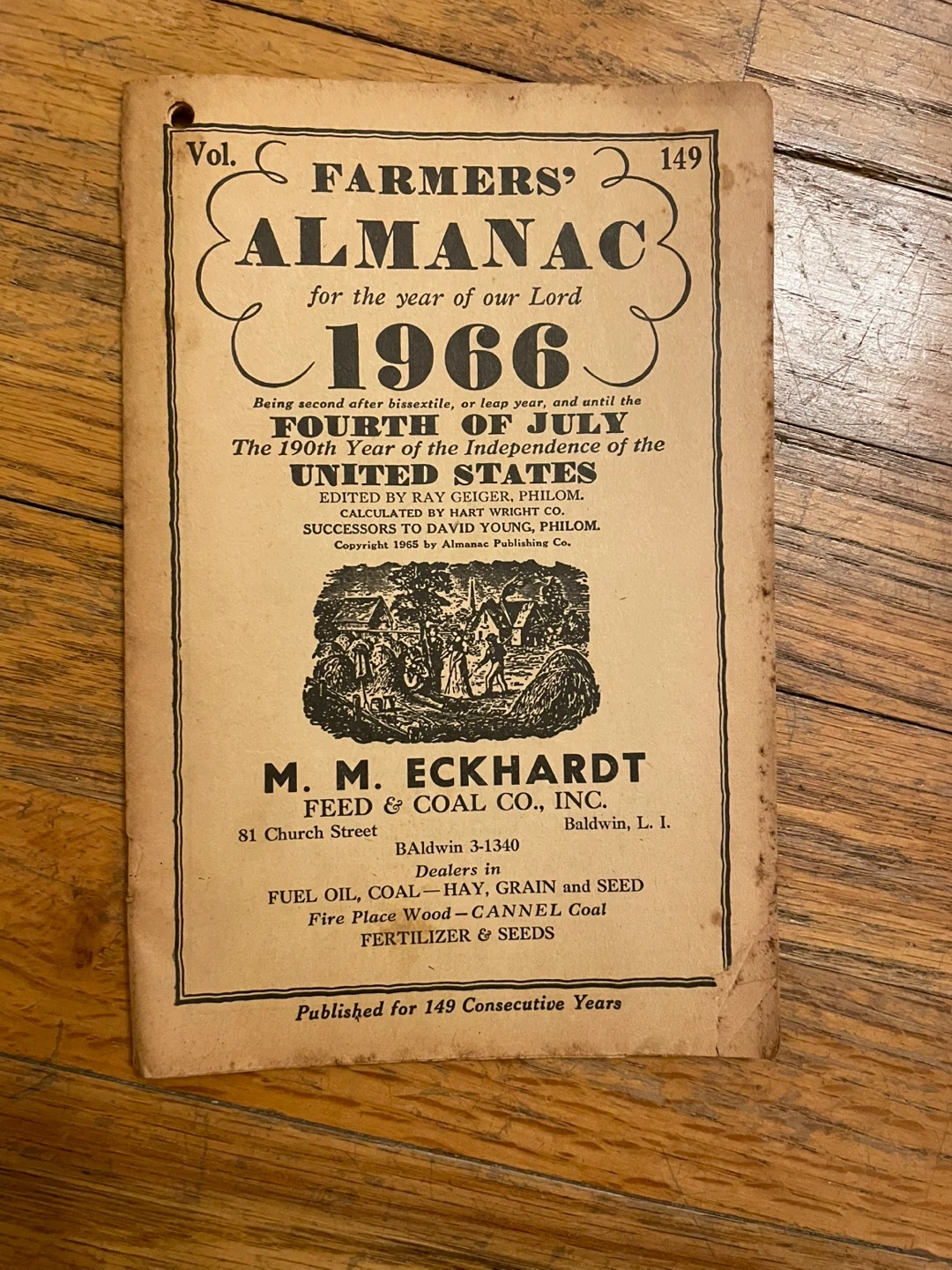 This is the Farmers' Almanac for the year of our Lord 1966. It's the second issue after bissextile, or leap year, and the 190th year of the Independence of the United States. The cover also lists M. M. Eckhardt Feed & Coal Co., Inc. as dealers in fuel oil, coal, hay, grain, seed, fire place wood, cannel coal, fertilizer, and seeds.