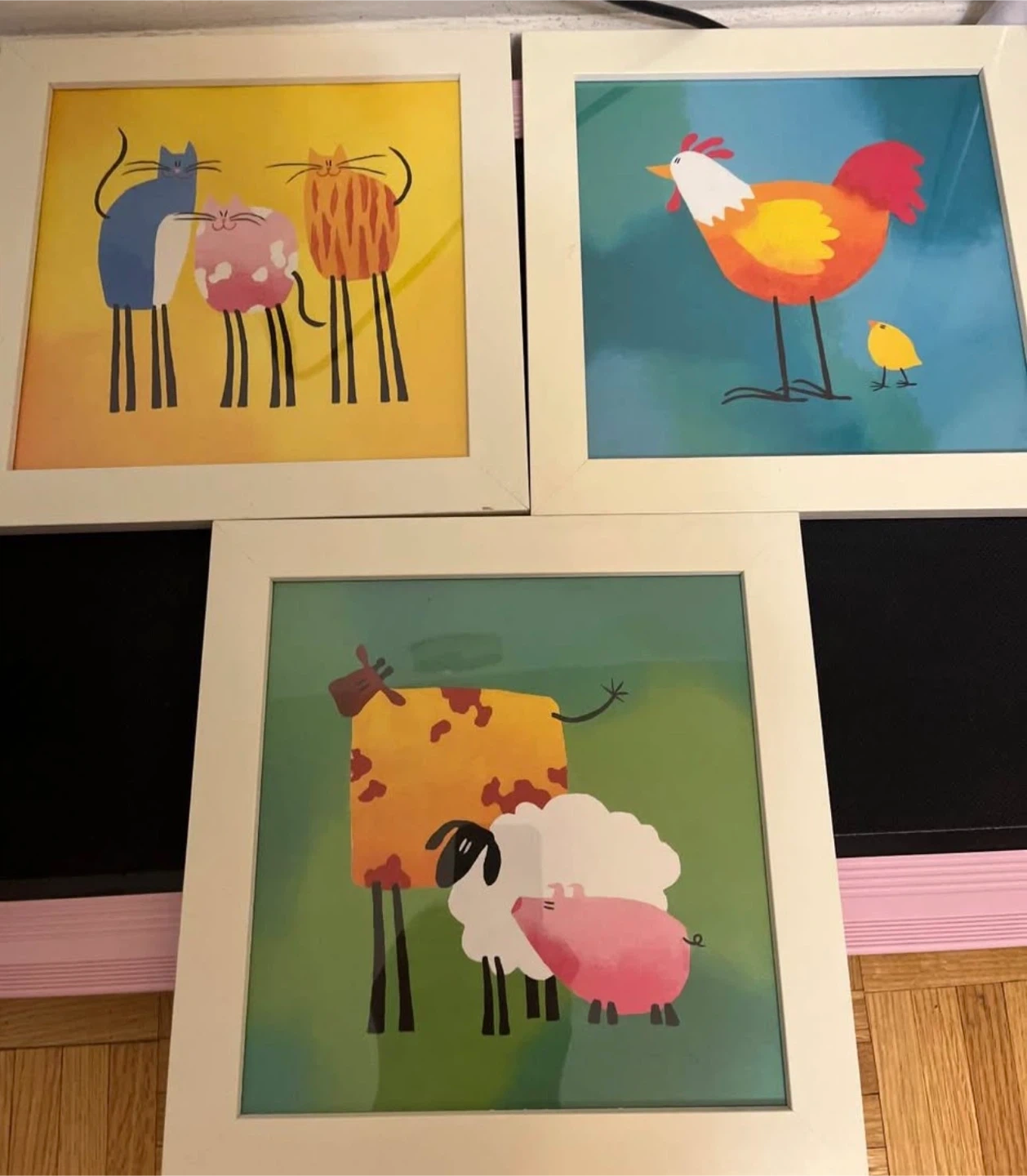 Set of three framed prints from IKEA featuring fun, stylized farm animals. Each print measures 20x20 cm (8x8 inches). Perfect for a child's room or nursery!