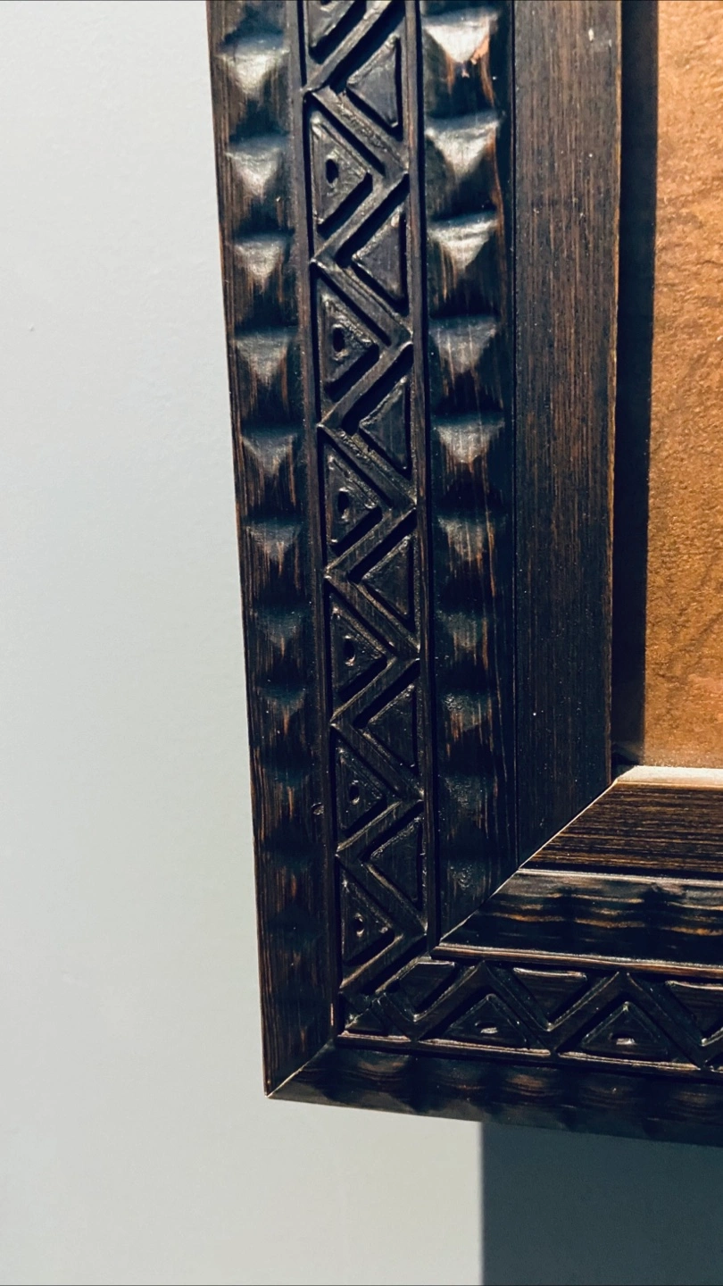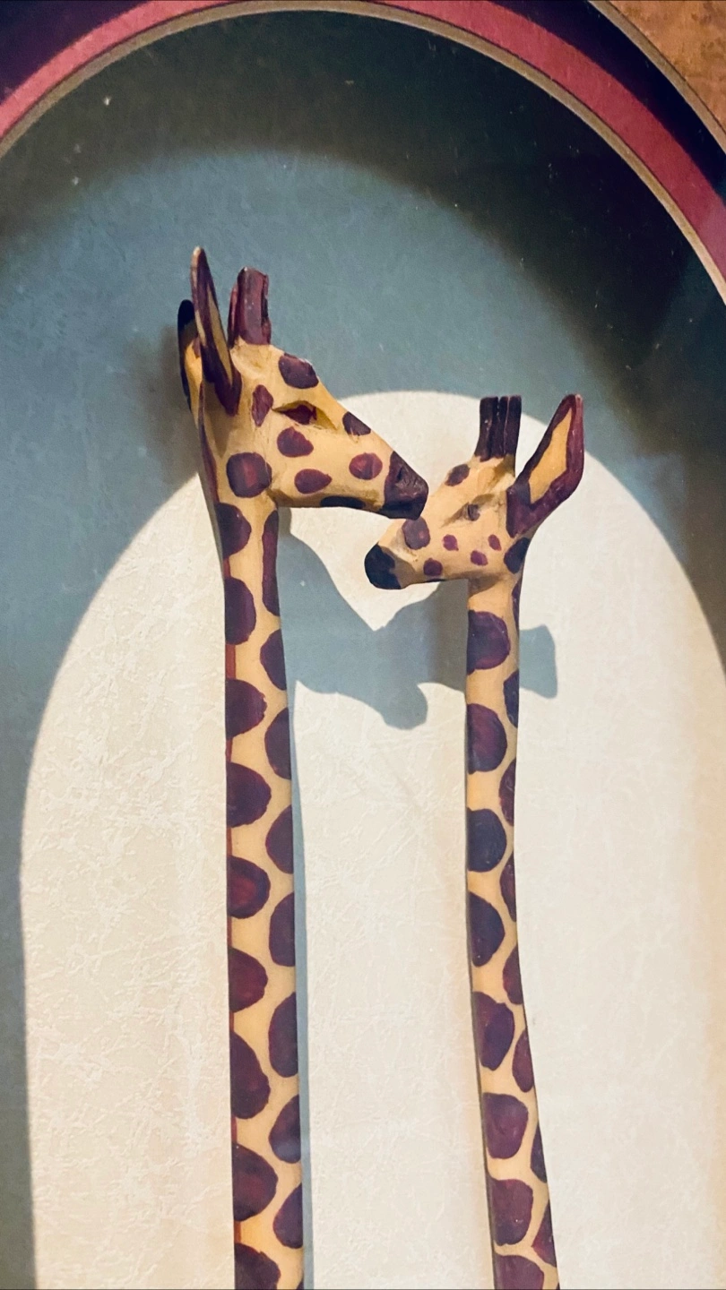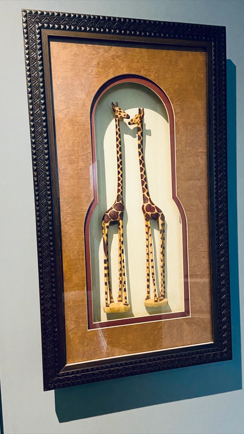 Beautiful wall art featuring two wooden giraffes in an intricately carved wooden frame. It would fit beautifully in an African themed room or if you’re a fan of a couple giraffes who are smitten with each-other 😊